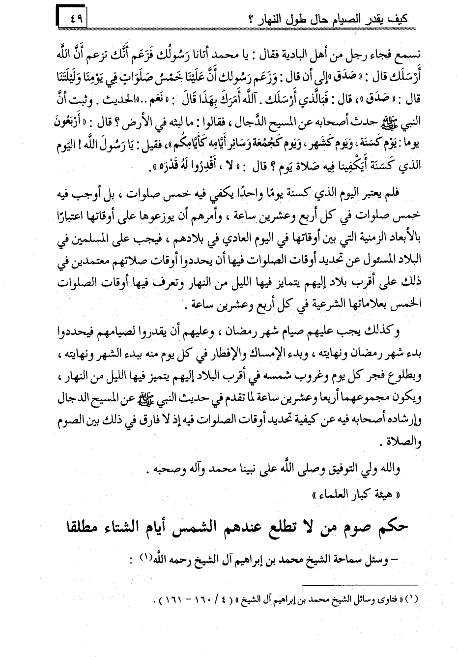 نسمع فجاء رجل من أهل الباديةَ فقال: يا محمد أتانا رَسُولُك فَزَعَم أَنَّك تزعم أَنَّ الله أَرْسَلَك قال: "صَدَق" إلى أن قال: وَزَعَم رَسُولك أَنَّ عَلَينَا خَمْسُ صَلَوَاتٍ في يَوْمِنَا وَلَيلَتَنَا قال: "صَدَق"، قال: فَبَالَّذي أَرْسَلَك. آلله أَمَرَكَ بِهَذَا قَالَ: "نَعَم.." الحديث. وثبت أنَّ النبي - صَلَّى اللَّهُ عَلَيْهِ وَسَلَّمَ - حدث أصحابه عن المسيح الدَّجال، فقالوا: ما لبثه في الأرض؟ قال: "أَربَعُونَ يوما: يَوْم كَسَنَة، وَيَوم كَشَهر، وَيَوم كَجُمُعَة وَسَائِر أَيامِه كَأَيَّامِكُم"، فقيل: يَا رَسولَ الله! اليَوم الذي كَسَنَة أَيَكْفِينا فِيه صَلاة يَوم؟ قال: "لا، أَقْدِرُوا لَهُ قَدْرَه".