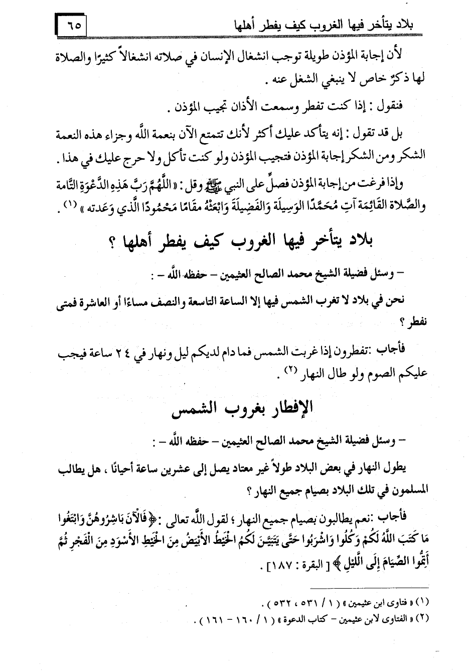 فأجاب: تفطرون إذا غربت الشمس فما دام لديكم ليل ونهار في 24 ساعة فيجب عليكم الصوم ولو طال النهار (2) .