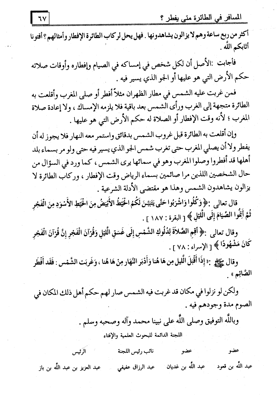 وإن أقلعت به الطائرة قبل غروب الشمس بدقائق واستمر معه النهار فلا يجوز له أن يفطر ولا أن يصلي المغرب حتى تغرب شمس الجو الذي يسير فيه حتى ولو مر بسماء بلد أهلها قد أفطروا وصلوا المغرب وهو في سمائها يرى الشمس، كما ورد في السؤال من حال الشخصين اللذين مرا صائمين بسماء الرياض وقت الإفطار، وركاب الطائرة لا يزالون يشاهدون الشمس وهذا هو مقتضى الأدلة الشرعية.
