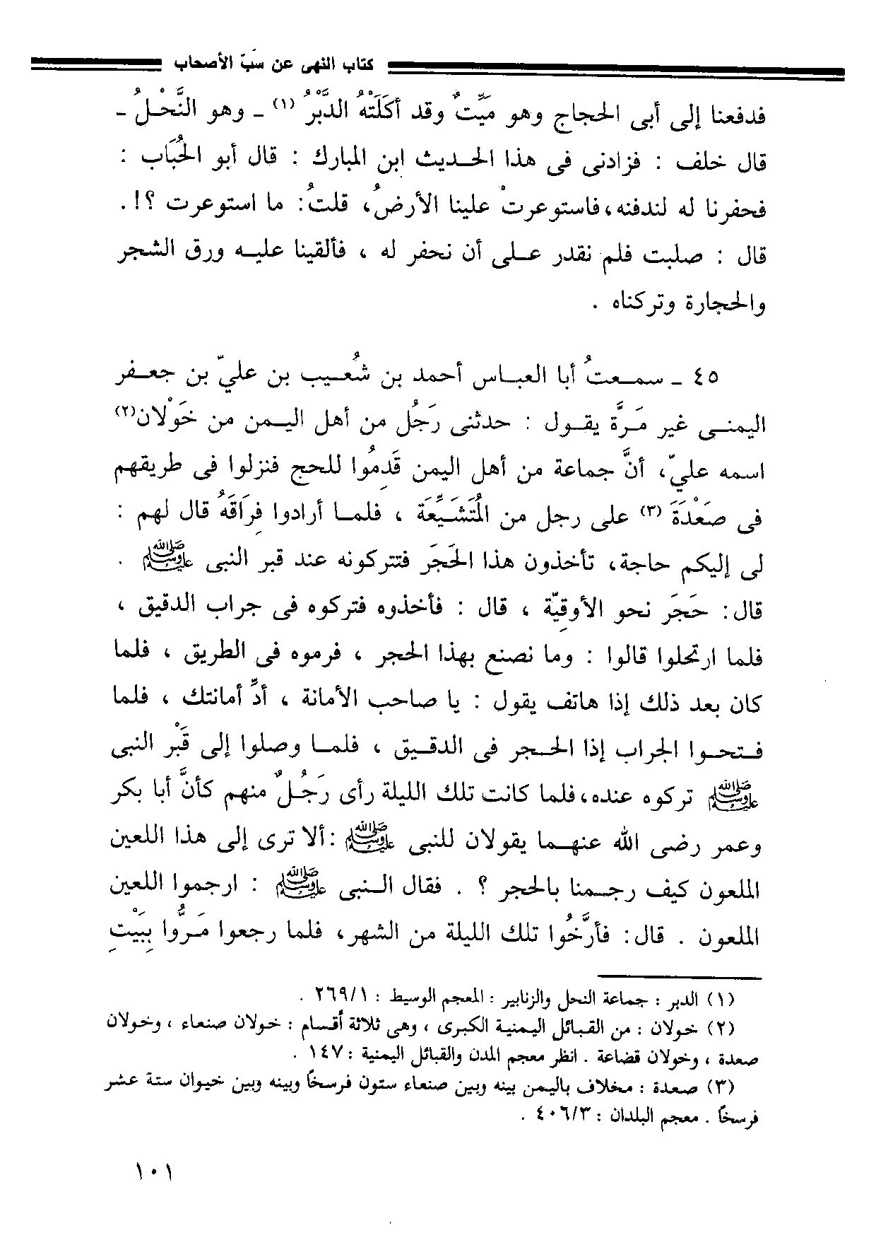 45 - سَمِعْتُ أَبَا الْعَبَّاسِ أَحْمَدَ بْنَ شُعَيْبِ بْنِ عَلِيِّ بْنِ جَعْفَرٍ الْيَمَنِيَّ غَيْرَ مَرَّةٍ يَقُولُ حَدَّثَنِي رَجُلٌ مِنْ أَهْلِ الْيَمَنِ مِنْ خَوْلَانَ اسْمُهُ عَلِيٌّ أَنَّ جَمَاعَةً مِنْ أَهْلِ الْيَمَنِ قَدِمُوا لِلْحَجِّ فَنَزَلُوا فِي طَرِيقِهِمْ فِي صَعْدَةٍ عَلَى رَجُلٍ مِنَ الْمُتَشَيِّعَةِ فَلَمَّا أَرَادُوا فِرَاقَهُ قَالَ لَهُمْ لِي إِلَيْكُمْ حَاجَةً تَأْخُذُونَ هَذَا الْحَجَرَ فَتَتْرُكُونَهُ عِنْدَ قَبْرِ النَّبِيِّ صَلَّى اللَّهُ عَلَيْهِ وَسَلَّمَ قَالَ حَجَرٌ نَحْوَ الْأَوْقِيَّةِ قَالَ فَأَخَذُوهُ فَتَرَكُوهُ فِي جِرَابِ الدَّقِيقِ فَلَمَّا ارْتَحَلُوا قَالُوا وَمَا نَصْنَعُ بِهَذَا الْحَجَرِ فَرَمَوْهُ فِي الطَّرِيقِ فَلَمَّا كَانَ بَعْدَ ذَلِكَ إِذَا هَاتِفٌ يَقُولُ يَا صَاحِبَ الْأَمَانَةِ أَدِّ أَمَانَتَكَ فَلَمَّا فَتَحُوا الْجِرَابَ إِذَا الْحَجَرُ فِي الدَّقِيقِ فَلَمَّا وَصَلُوا إِلَى قَبْرِ النَّبِيِّ صَلَّى اللَّهُ عَلَيْهِ وَسَلَّمَ تَرَكُوهُ عِنْدَهُ
