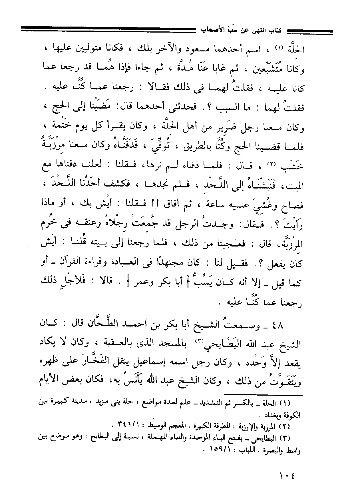 48 - وَسَمِعْتُ الشَّيْخَ أَبَا بَكْرِ بْنَ أَحْمَدَ الطَّحَّانَ قَالَ كَانَ الشَّيْخُ عَبْدُ اللَّهِ الْبَطَايِحِيُّ بِالْمَسْجِدِ الَّذِي بِالْعَقَبَةِ وَكَانَ لَا يَكَادُ يَقْعُدُ إِلَّا وَحْدَهُ وَكَانَ رَجُلٌ اسْمُهُ إِسْمَاعِيلُ يَنْقُلُ الْفَخَّارَ عَلَى ظَهْرِهِ وَيَتَقَوَّتُ مِنْ ذَلِكَ وَكَانَ الشَّيْخُ عَبْدُ اللَّهِ يَأْنَسُ بِهِ فَكَانَ بَعْضُ الْأَيَّامِ -[105]- عِنْدَهُ وَأَنَا حَاضِرٌ فَقَالَ لَهُ يَا شَيْخُ إِسْمَاعِيلُ أَلَا تُحَدِّثُنِي عَنْ أَعْجَبِ شَيْءٍ رَأَيْتَهُ فَقَالَ