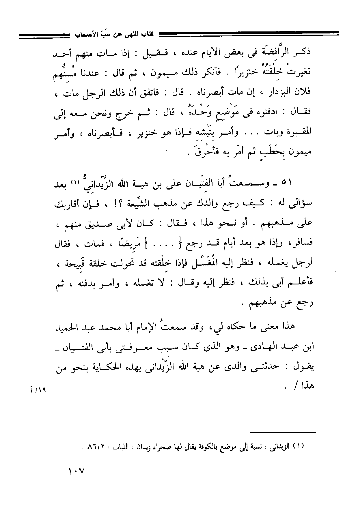 51 - وَسَمِعْتُ أَبَا الْفِتْيَانِ عَلِيَّ بْنَ هبة اللَّهِ الزَّيْدَانِيَّ بَعْدَ سُؤَالِي لَهُ كَيْفَ رَجَعَ وَالِدُكَ عَنْ مَذْهَبِ الشِّيعَةِ فَإِنَّ أَقَارِبَكَ عَلَى مَذْهَبِهِمْ أَوْ نَحْوَ هَذَا فَقَالَ كَانَ لِأَبِي صَدِيقٌ مِنْهُمْ فَسَافَرَ وَإِذَا هُوَ بَعْدَ أَيَّامٍ قَدْ رَجَعَ .. .. مَرِيضًا فَمَاتَ فَقَالَ لِرَجُلٍ يُغَسِّلُهُ فَنَظَرَ إِلَيْهِ الْمُغَسِّلُ فَإِذَا خِلْقَتُهُ قَدْ تَحَوَّلَتْ خِلْقَةً قَبِيحَةً فَأُعْلِمَ أَبِي بِذَلِكَ فَنَظَرَ إِلَيْهِ وَقَالَ لَا تُغَسِّلْهُ وَأَمَرَ بِدَفْنِهِ ثُمَّ رَجَعَ عَنْ مَذْهَبِهِمْ