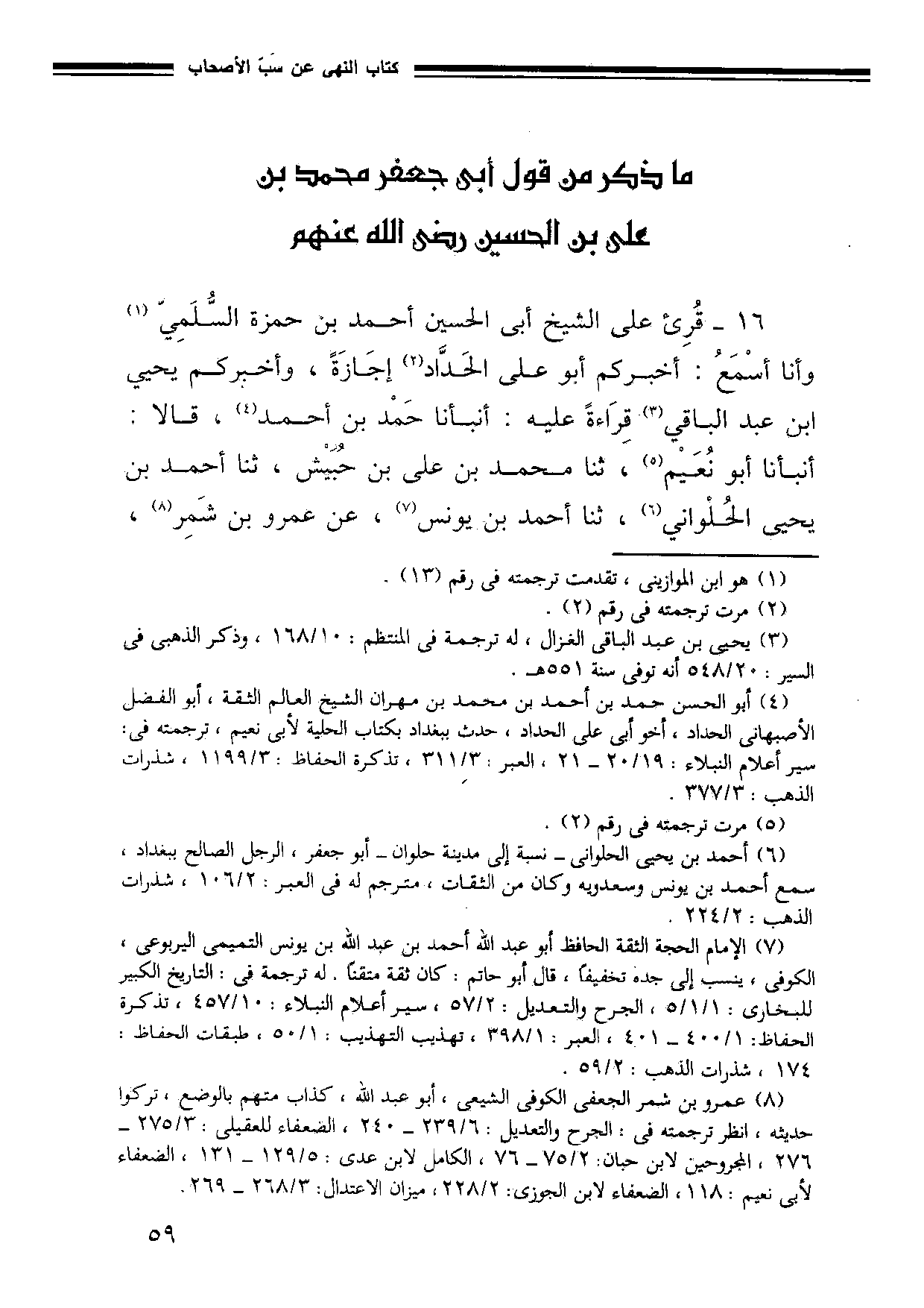 16 - قُرِئَ عَلَى الشَّيْخِ أَبِي الْحُسَيْنِ أَحْمَدَ بْنِ حَمْزَةَ السُّلَمِيِّ وَأَنَا أَسْمَعُ أَخْبَرَكُمْ أَبُو عَلِيٍّ الْحَدَّادُ إِجَازَةً وَأَخْبَرَكُمْ يَحْيَى بْنُ عَبْدِ الْبَاقِي قِرَاءَةً عَلَيْهِ أَنْبَأَنَا حَمْدُ بْنُ أَحْمَدَ قَالَا أَنْبَأَنَا أَبُو نُعَيْمٍ ثَنَا مُحَمَّدُ بْنُ عَلِيِّ بْنِ حُبَيْشٍ ثَنَا أَحْمَدُ بْنُ يَحْيَى الْحُلْوَانِيُّ ثَنَا أَحْمَدُ بْنُ يُونُسَ عَنْ عَمْرِو بْنِ شَمِرٍ -[60]- عَنْ جَابِرٍ قَالَ قَالَ لِي مُحَمَّدُ بْنُ عَلِيٍّ يَا جَابِرُ بَلَغَنِي أَنَّ قَوْمًا بِالْعِرَاقِ يَزْعُمُونَ أَنَّهُمْ يُحبَّونَنَا وَيَتَنَاوَلُونَ أَبَا بَكْرٍ وَعُمَرَ وَيَزْعُمُونَ أَنِّي آمُرُهُمْ بِذَلِكَ فَأَبْلِغْهُمْ أَنِّي إِلَى اللَّهِ مِنْهُمْ بَرِيءٌ، وَالَّذِي نَفْسُ مُحَمَّدٍ بِيَدِهِ لَوْ وَلِيتُ لَتَقَرَّبْتُ إِلَى اللَّهِ تَعَالَى بِدِمَائِهِمْ، لَا نَالَتْنِي شَفَاعَةُ مُحَمَّدٍ إِنْ لَمْ أَكُنْ أَسْتَغْفِرُ لَهُمَا وَأَتَرَحَّمُ عَلَيْهِمَا، إِنَّ أَعْدَاءَ اللَّهِ لَغَافِلُونَ عَنْهُمَا.