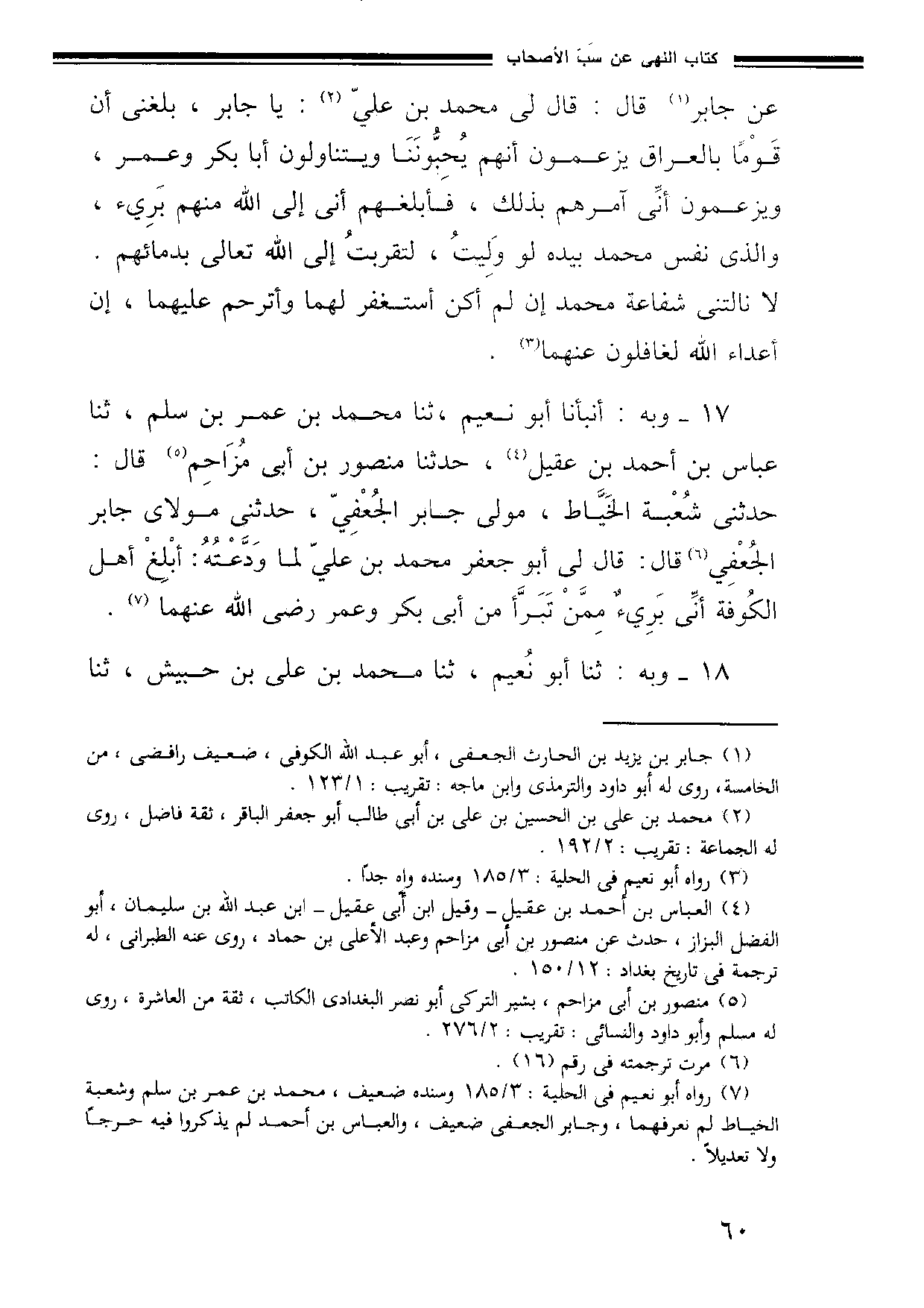 17 - وَبِهِ أَنْبَأَنَا أَبُو نُعَيْمٍ ثَنَا مُحَمَّدُ بْنُ عُمَرَ بْنِ سَلْمٍ ثَنَا عَبَّاسُ بْنُ أَحْمَدَ بْنِ عُقَيْلٍ حَدَّثَنَا مَنْصُورُ بْنُ أَبِي مُزَاحِمٍ قَالَ حَدَّثَنِي شُعْبَةُ الْخَيَّاطُ مَوْلَى جَابِرِ الْجُعْفيِّ حَدَّثَنِي مَوْلَايَ جَابِرٌ الْجُعْفِيُّ قَالَ قَالَ لِي أَبُو جَعْفَرٍ مُحَمَّدُ بْنُ عَلِيٍّ لَمَّا وَدَّعْتُهُ أَبْلِغْ أَهْلَ الْكُوفَةِ أَنِّي بَرِيءٌ مِمَّنْ تَبَرَّأَ مِنْ أَبِي بَكْرٍ وَعُمَرَ رَضِيَ اللَّهُ عَنْهُمَا.