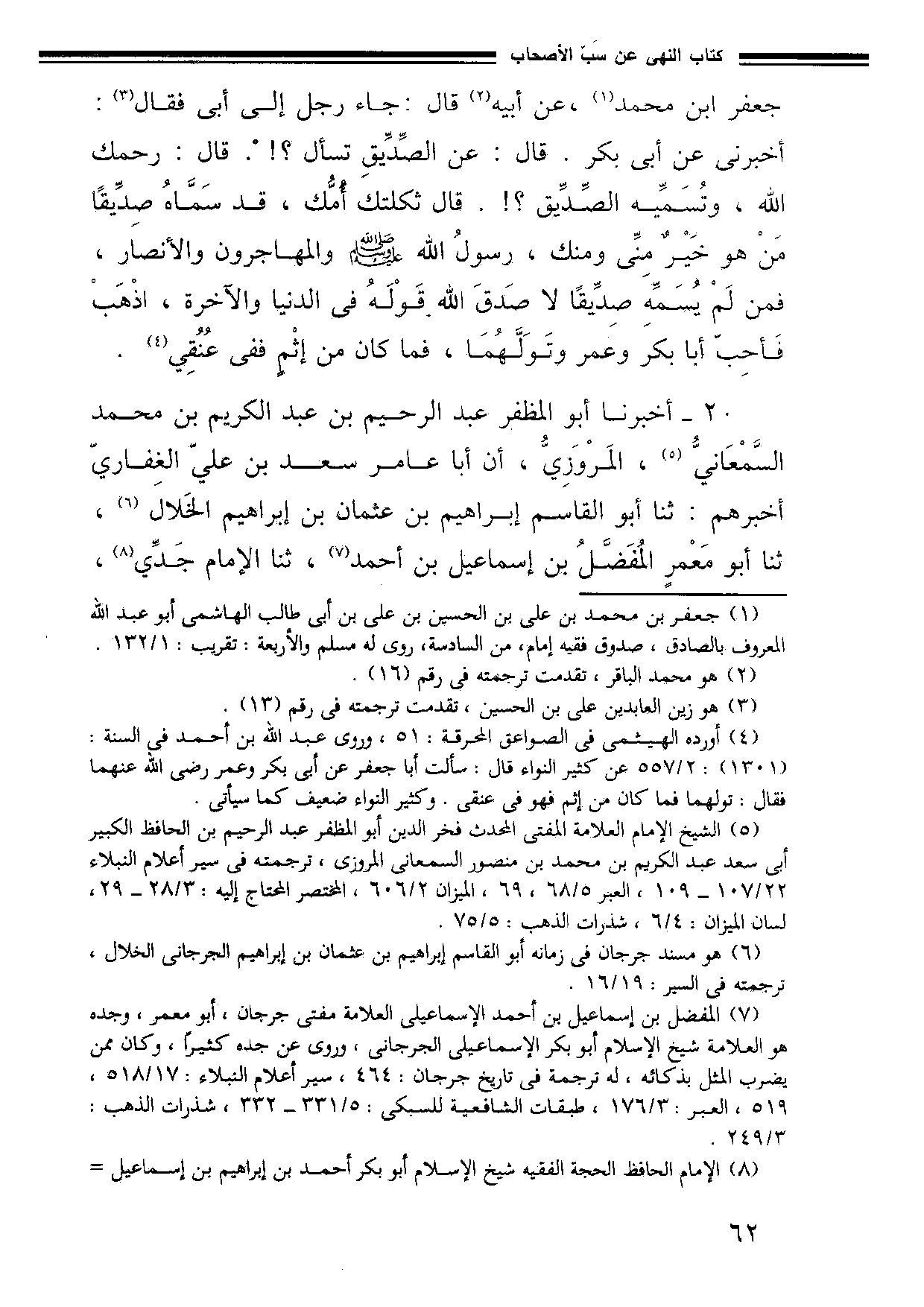 20 - أَخْبَرَنَا أَبُو الْمُظَفَّرِ عَبْدُ الرَّحِيمِ بْنُ عَبْدِ الْكَرِيمِ بْنِ مُحَمَّدٍ السَّمْعَانيُّ الْمَرْوَزِيُّ أَنَّ أَبَا عَامِرٍ سعد بن علي الغفاري أخبرهم ثنا أبو القاسم إِبْرَاهِيمَ بْنِ عُثْمَانَ بْنِ إِبْرَاهِيمَ الْخَلَّالَ ثَنَا أَبُو مَعْمرٍ الْمُفَضَّلُ بْنُ إِسْمَاعِيلَ بْنِ أَحْمَدَ ثَنَا الْإِمَامُ جَدِّي -[63]- ثَنَا أَبُو الْحَسَنِ عَلِيُّ بْنُ مُحَمَّدِ بْنِ حَاتِمٍ الْقُومَسِيُّ ثَنَا الْحُسَيْنُ بْنُ عَبْدِ الْمُؤْمِنِ بْنِ عَبْدِ الرَّحْمَنِ ثَنَا عَبْدُ اللَّهِ يَعْنِي ابْنَ دَاوُدَ الْوَاسِطِيَّ التَّمَّارَ ثَنَا يَحْيَى بْنَ الْمُتَوَكِّلِ عَنْ كَثِيرٍ النَّوَّاءِ قَالَ قُلْتُ لِأَبِي جَعْفَرٍ مُحَمَّدِ بْنِ عَلِيِّ بْنِ الْحُسَيْنِ بْنِ عَلِيِّ بْنِ أَبِي طَالِبٍ رَضِيَ اللَّهُ عَنْهُمْ: إِي جَعَلَنِي اللَّهُ فِدَاكَ إِنَّ النَّاسَ يَقُولُونَ إِنَّ أَبَا بَكْرٍ وَعُمَرَ ظَلَمَاكُمْ وَذَهَبَا بِحَقِّكُمْ فَقَالَ لَا وَالَّذِي أَنْزَلَ الْفُرْقَانَ عَلَى عَبْدِهِ لِيَكُونَ لِلْعَالَمِينَ نَذِيرًا مَا ظَلَمَانَا وَلَا ذَهَبَا مِنْ حَقِّنَا مَا يَزِنُ حَبَّةَ خَرْدَلٍ، قُلْتُ إِي جَعَلَنِي اللَّهُ فِدَاكَ أَفَأَتَوَلَّاهُمَا؟ فَضَرَبَ يَدَهُ عَلَى عَاتِقِي وَقَالَ لِي وَيْحَكَ يَا كَثِيرُ تَوَلَّهُمَا فِي الدُّنْيَا وَالْآخِرَةِ فَمَا أَصَابَكَ فَفِي عُنُقِي، بَرِئَ اللَّهُ وَرَسُولُهُ مِمَّنْ كَذَبَ -[64]- عَلَيْنَا أَهْلَ الْبَيْتِ يَعْنِي الْمُغِيرَةَ بْنَ فُلَانٍ السَّاحِرَ وَبَيَانَ الْمَدِينِيَّ إِنَّهُمَا كَذِبَا عَلَيْنَا.