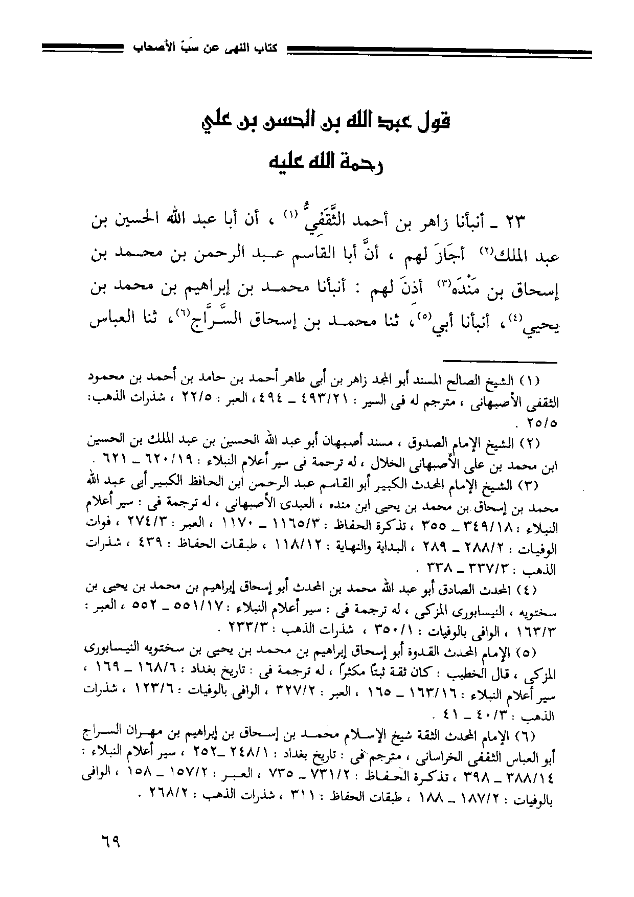 23 - أَنْبَأَنَا زَاهِرُ بْنُ أَحْمَدَ الثَّقَفِيُّ أَنَّ أَبَا عَبْدِ اللَّهِ الْحُسَيْنَ بْنَ عَبْدِ الْمَلِكِ أَجَازَ لَهُمْ أَنَّ أَبَا الْقَاسِمِ عَبْدَ الرَّحْمَنِ بْنَ مُحَمَّدِ بْنِ إِسْحَاقَ بْنِ مَنْدَهْ أَذِنَ لَهُمْ أَنْبَأَنَا مُحَمَّدُ بْنُ إِبْرَاهِيمَ بْنِ مُحَمَّدِ بْنِ يَحْيَى أَنْبَأَنَا أَبِي ثَنَا مُحَمَّدُ بْنُ إِسْحَاقَ السَّرَّاجُ ثَنَا الْعَبَّاسُ -[70]- بْنُ أَبِي طَالِبٍ ثَنَا بِشْرُ بْنُ آدَمَ ثَنَا عَبْثَرُ بْنُ الْقَاسِمِ أَبُو زُبَيْدٍ ثَنَا عَمَّارُ بْنُ رُزَيْقٍ الضَّبِّيُّ عَنْ عَبْدِ اللَّهِ بْنِ الْحَسَنِ قَالَ مَا أَرَى رَجُلًا يَسُبُّ أَبَا بَكْرٍ وَعُمَرَ تُيَسَّرُ لَهُ تَوْبَةٌ أَبَدًا.