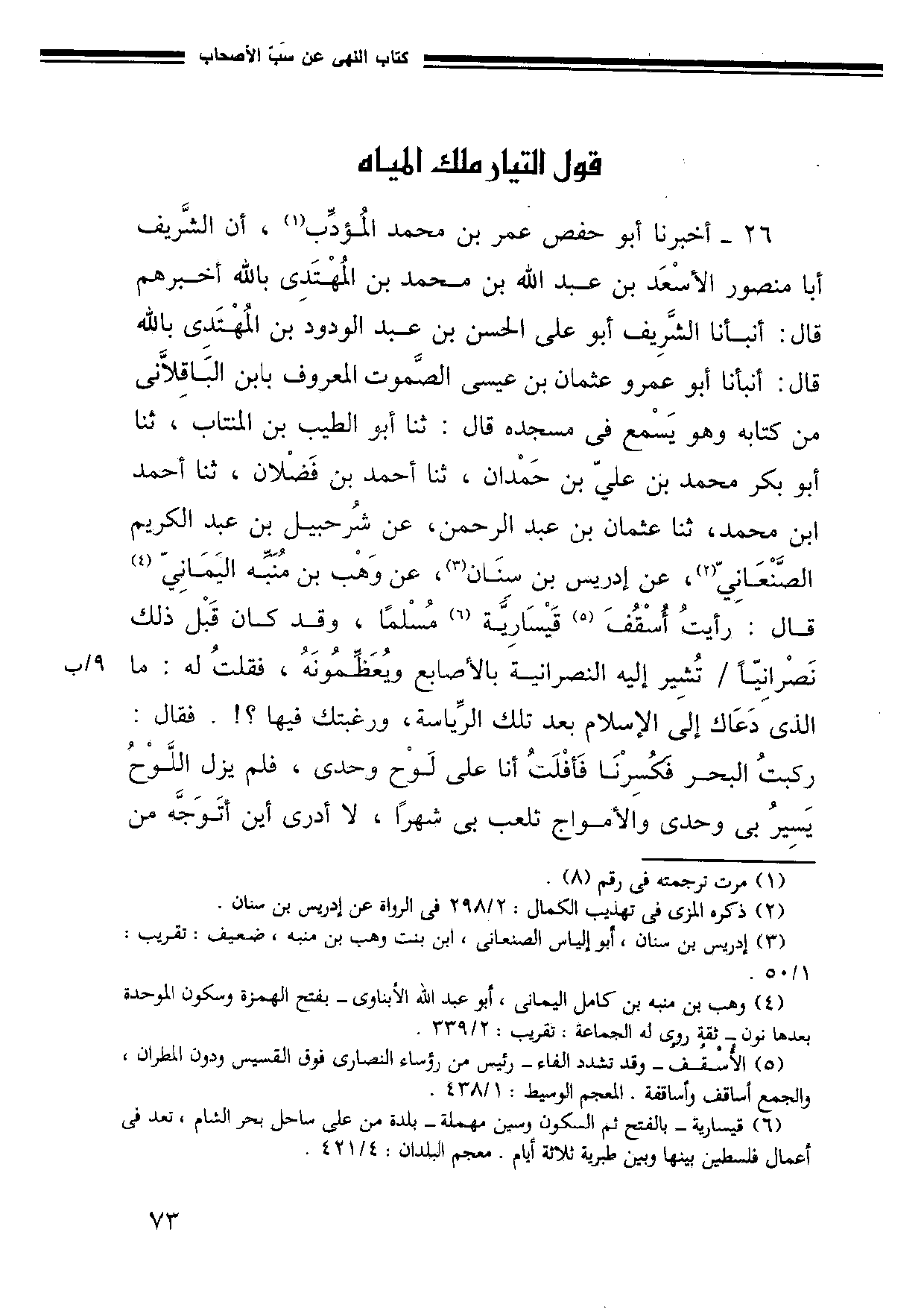26 - أَخْبَرَنَا أَبُو حَفْصٍ عُمَرُ بْنُ مُحَمَّدِ الْمُؤدِّبُ أَنَّ الشَّرِيفَ أَبَا مَنْصُورٍ الْأَسْعَدَ بْنَ عَبْدِ اللَّهِ بْنِ مُحَمَّدِ بْنِ الْمُهْتَدِي بِاللَّهِ أَخْبَرَهُمْ قَالَ أَنْبَأَنَا الشَّرِيفُ أَبُو عَلِيٍّ الْحَسَنُ بْنُ عَبْدِ الْوَدُودِ بْنِ الْمُهْتَدِي بِاللَّهِ قَالَ أَنْبَأَنَا أَبُو عَمْرٍو عُثْمَانُ بْنُ عِيسَى الصَّمُوتُ الْمَعْرُوفُ بِابْنِ الْبَاقِلَّانِيُّ مِنْ كِتَابِهِ وَهُوَ يَسْمَعُ فِي مَسْجِدِهِ قَالَ ثَنَا أَبُو الطَّيِّبِ بْنُ الْمُنْتَابِ ثَنَا أَبُو بَكْرٍ مُحَمَّدُ بْنُ عَلِيِّ بْنِ حَمْدَانَ ثَنَا أَحْمَدُ بْنُ فَضْلَانَ ثَنَا أَحْمَدُ بْنُ مُحَمَّدٍ ثَنَا عُثْمَانُ بْنُ عَبْدِ الرَّحْمَنِ عَنْ شُرَحْبِيلَ بْنِ عَبْدِ الْكَرِيمِ الصَّنْعَانِيُّ عَنْ إِدْرِيسَ بْنِ سِنَانٍ عَنْ وَهْبِ بْنِ مُنَبِّهٍ الْيَمَانِيِّ قَالَ
