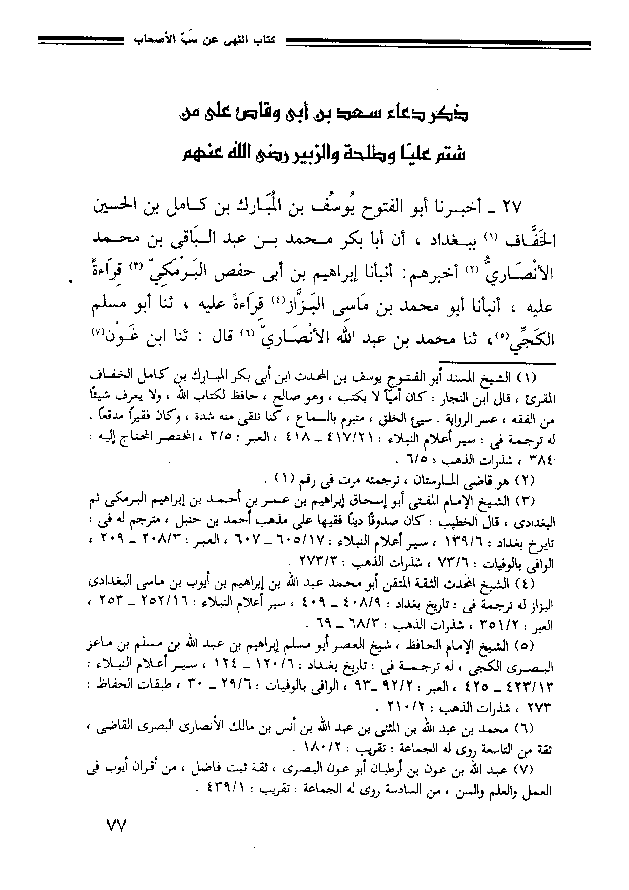 27 - أَخْبَرَنَا أَبُو الْفُتُوحِ يُوسُفُ بْنُ الْمُبَارَكِ بْنِ كَامِلِ بْنِ الْحُسَيْنِ الْخَفَّافُ بِبَغْدَادَ أَنَّ أَبَا بَكْرٍ مُحَمَّدَ بْنَ عَبْدِ الْبَاقِي بْنِ مُحَمَّدٍ الْأَنْصَارِيَّ أَخْبَرَهُمْ أَنْبَأَنَا إِبْرَاهِيمُ بْنُ أَبِي حَفْصٍ الْبَرْمَكِيُّ قِرَاءَةً عَلَيْهِ أَنْبَأَنَا أَبُو مُحَمَّدِ بْنُ مَاسِيٍّ الْبَزَّازُ قِرَاءَةً عَلَيْهِ ثَنَا أَبُو مُسْلِمٍ الْكَجِّيُّ ثَنَا مُحَمَّدُ بُنْ عَبْدِ اللَّهِ الْأَنْصَارِيُّ قَالَ ثَنَا ابْنُ عَوْنٍ -[78]- قَالَ أَنْبَأَنِي مُحَمَّدُ بْنُ مُحَمَّدِ بْنِ الْأَسْوَدِ عَنْ عَامِرِ بْنِ سَعْدٍ قَالَ بَيْنَمَا سَعْدٌ يَعْنِي ابْنَ أَبِي وَقَّاصٍ رَضِيَ اللَّهُ عَنْهُ يَمْشِي إِذْ مَرَّ بِرَجُلٍ وَهُوَ يَشْتُمُ عَلِيًّا وَطَلْحَةَ وَالزُّبيْرَ رِضْوَانُ اللَّهُ عَلَيْهِمْ فَقَالَ لَهُ سَعْدٌ إِنَّكَ لَتَشْتُمُ قَوْمًا قَدْ سَبَقَ لَهُمْ مِنَ اللَّهِ مَا سَبَقَ وَاللَّهِ لَتَكُفَّنَّ عَنْ شَتْمِهِمْ أَوْ لَأَدْعُوَنَّ اللَّهَ عَلَيْكَ قَالَ يُخَوِّفُنِي كَأَنَّهُ نَبِيٌّ قَالَ فَقَالَ سَعْدٌ اللَّهُمَّ إِنْ كَانَ هَذَا يَسُبُّ أَقْوَامًا قَدْ سَبَقَ لَهُمْ مِنْكَ مَا سَبَقَ فَاجْعَلْهُ الْيَوْمَ نَكَالًا قَالَ فجاءت بختية فأفرج الناس لها فَتَخَبَّطَتْهُ قَالَ فَرَأَيْتُ النَّاسَ يَتْبَعُونَ سَعْدًا وَيَقُولُونَ اسْتَجَابَ اللَّهُ لَكَ أَبَا إِسْحَاقَ.