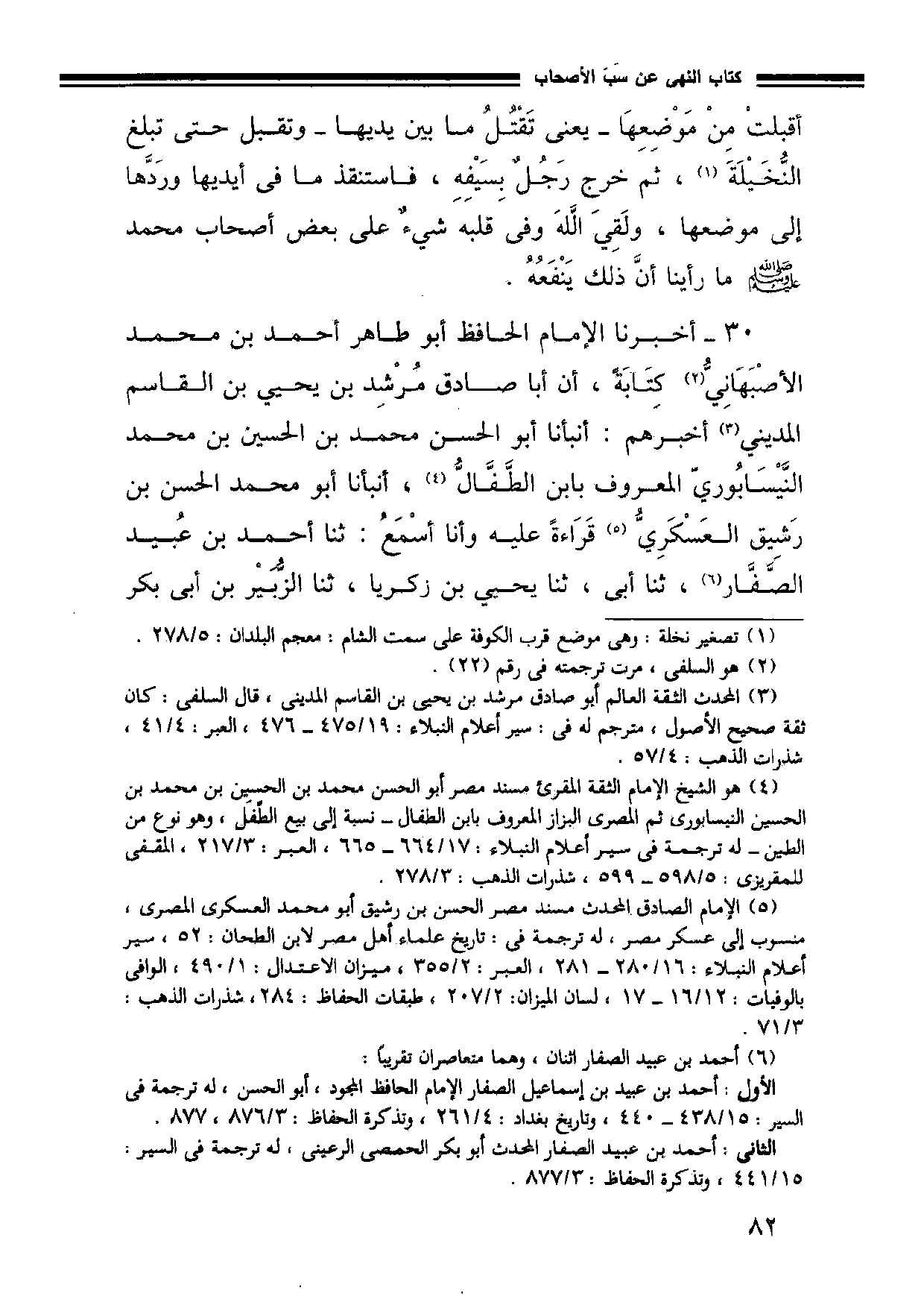 30 - أخبرنا الإمام الحافظ أبوطاهر أَحْمَدُ بْنُ مُحَمَّدٍ الْأَصْبَهَانِيُّ كِتَابَةً أَنَّ أَبَا صَادِقٍ مُرْشِدَ بْنَ يَحْيَى بْنِ الْقَاسِمِ الْمَدِينِيَّ أَخْبَرَهُمْ أَنْبَأَنَا أَبُو الْحَسَنِ مُحَمَّدُ بْنُ الحسين بن محمد النيسابوري المعروف بابن الطفال أَنْبَأَنَا أَبُو مُحَمَّدٍ الْحَسَنُ بْنُ رشيق العسكري قِرَاءَةً عَلَيْهِ وَأَنَا أَسْمَعُ ثَنَا أَحْمَدُ بْنُ عُبَيْدٍ الصَّفَّارُ ثَنَا أَبِي ثَنَا يَحْيَى بْنُ زَكَرِيَّا ثَنَا الزُّبَيْرُ بْنُ أَبِي بَكْرٍ -[83]- الزُّبَيْرِيُّ حَدَّثَنِي عَمَّى مُصْعَبُ بْنُ عَبْدِ اللَّهِ حَدَّثَنِي أَبِي عَبْدُ اللَّهِ بْنُ مُصْعَبٍ قَالَ قَالَ لِي أَمِيرُ الْمُؤْمِنِينَ يَا أَبَا بَكْرٍ مَا تَقُولُ فِي الَّذيِنَ يَشْتِمُونَ أَصْحَابَ رَسُولِ اللَّهِ صَلَّى اللَّهُ عَلَيْهِ وَسَلَّمَ فَقُلْتُ زَنَادِقَةٌ يَا أَمِيرَ الْمُؤْمِنِينَ قَالَ مَا عَلِمْتُ أَحَدًا قَالَ هَذَا غَيْرُكَ فَكَيْفَ ذَلِكَ قُلْتُ إِنَّمَا هُمْ قَوْمٌ أَرَادُوا رَسُولَ اللَّهِ صَلَّى اللَّهُ عَلَيْهِ وَسَلَّمَ فَلَمْ يَجِدُوا أَحَدًا مِنَ الْأُمَّةِ يُتَابِعُهُمْ عَلَى ذَلِكَ فِيهِ فَشَتَمُوا أَصْحَابَهُ رَضِيَ اللَّهُ عَنْهُمْ يَا أَمِيرَ الْمُؤْمِنِينَ مَا أَقْبَحَ بِالرَّجُلِ أَنْ يَصْحَبَ صَحَابَةَ السُّوءِ فَكَأَنَّهُمْ قَالُوا رَسُولُ اللَّهِ صَحِبَ صَحَابَةَ السُّوءِ، فَقَالَ لِي مَا أَرَى الْأَمْرَ إِلَّا كَمَا قُلْتَ.