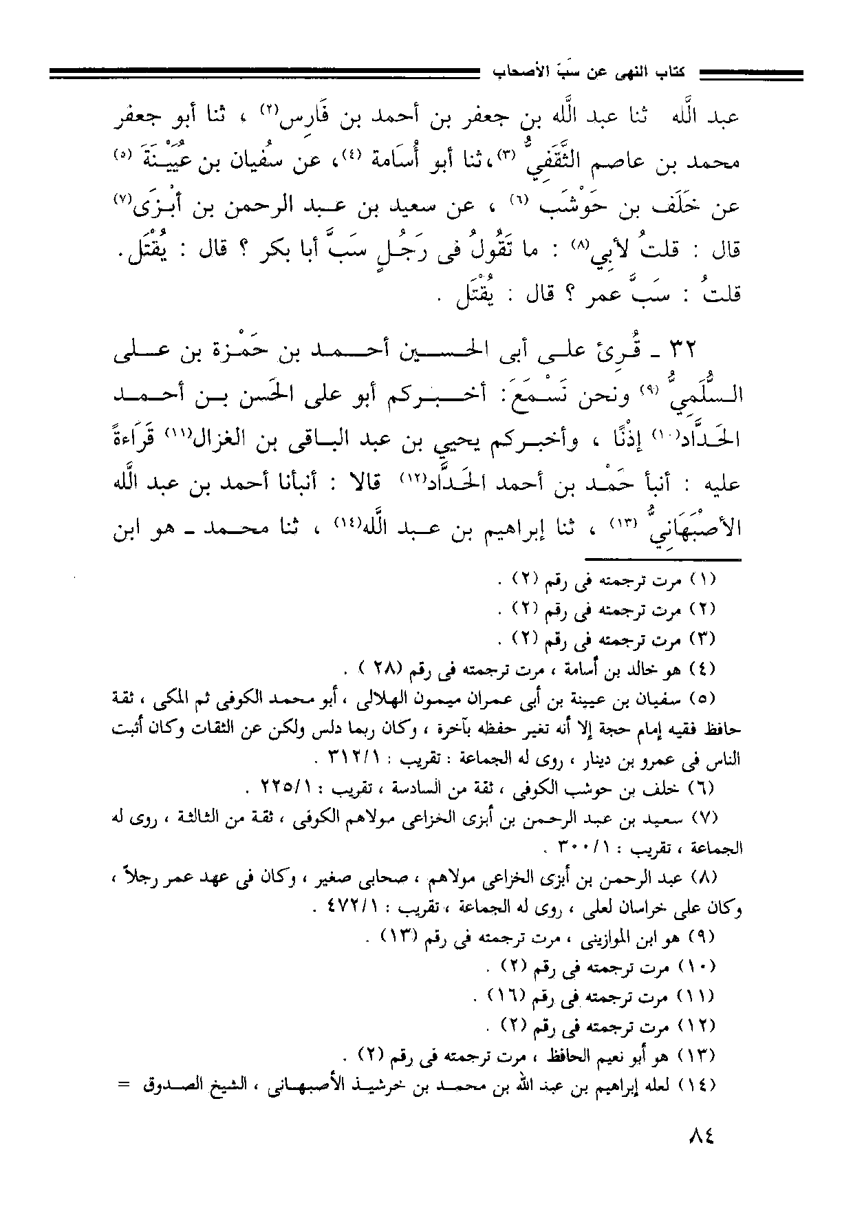 32 - قُرِئَ عَلَى أَبِي الْحُسَيْنِ أَحْمَدَ بْنِ حَمْزَةَ بْنِ عَلِيٍّ السُّلَمِيُّ وَنَحْنُ نَسْمَعُ أَخْبَرَكُمْ أَبُو عَلِيٍّ الْحَسَنَ بْنُ أَحْمَدَ الْحَدَّادُ إِذْنًا وَأَخْبَرَكُمْ يَحْيَى بْنُ عَبْدِ الْبَاقِي بْنِ الْغَزَّالِ قِرَاءَةً عَلَيْهِ أَنْبَأَ حمد بن أَحْمَدَ الْحَدَّادُ قَالَا أَنْبَأَنَا أَحْمَدُ بْنُ عَبْدِ اللَّهِ الْأَصْبَهَانِيُّ ثَنَا إِبْرَاهِيمُ بْنُ عَبْدِ اللَّهِ ثَنَا مُحَمَّدٌ هُوَ ابْنُ -[85]- إِسْحَاقَ ثَنَا سَوَّارُ بْنُ عَبْدِ اللَّهِ الْعَنْبَرِيُّ ثَنَا أَبِي قَالَ قَالَ مَالِكُ بْنُ أَنَسٍ مَنْ تَنَقَّصَ أَحَدًا مِنْ أَصْحَابِ رَسُولِ اللَّهِ صَلَّى اللَّهُ عَلَيْهِ وَسَلَّمَ أَوْ كَانَ فِي قَلْبِهِ عَلَيْهِمْ غِلٌّ فَلَيْسَ لَهُ حَقٌّ فِي فَيْءِ الْمُسْلِمِينَ ثُمَّ تَلَا قَوْلَ اللَّهِ عَزَّ وَجَلَّ: {مَا أَفَاءَ اللَّهُ عَلَى رسوله} حَتَّى أَتَى عَلَى قَوْلِهِ عَزَّ وَجَلَّ: {وَالَّذِينَ جَاءُوا مِنْ بَعْدِهِمْ يَقُولُونَ رَبَّنَا اغْفِرْ لَنَا وَلإِخْوَانِنَا الذين سبقونا بالإيمان} الآية فَمَنْ يُنْقِصْهُمْ أَوْ كَانَ فِي قَلْبِهِ عَلَيْهِمْ غِلٌّ فَلَيْسَ لَهُ فِي الْفَيْءِ حَقٌّ.