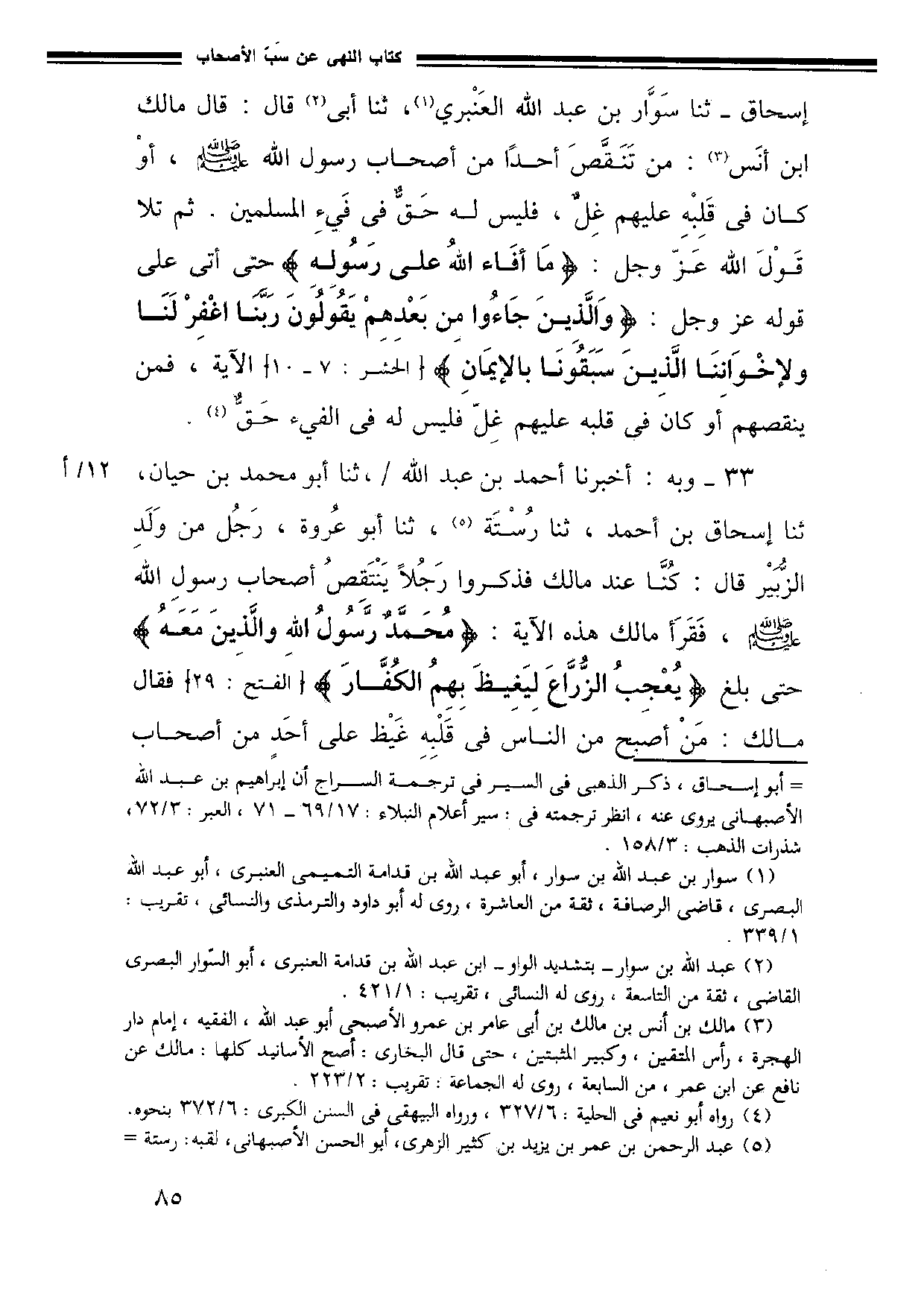 33 - وَبِهِ أَخْبَرَنَا أَحْمَدُ بْنُ عَبْدِ اللَّهِ ثَنَا أَبُو مُحَمَّدِ بْنُ حَيَّانَ ثَنَا إِسْحَاقُ بْنُ أَحْمَدَ ثَنَا رُسْتَهْ ثَنَا أَبُو عُرْوَةَ رَجُلٌ مِنْ وَلَدِ الزُّبَيْرِ قَالَ كُنَّا عِنْدَ مَالِكِ فَذَكَرُوا رَجُلًا يَنْتَقِصُ أَصْحَابَ رَسُولِ اللَّهِ صَلَّى اللَّهُ عَلَيْهِ وَسَلَّمَ فَقَرَأ مَالِكٌ هَذِهِ الْآيَةَ: {مُحَمَّدٌ رَسُولُ اللَّهِ والذين معه}. حتى بلغ: {يعجب الزراع ليغيض بهم الكفار}. فَقَالَ مَالِكٌ مَنْ أَصْبَحَ مِنَ النَّاسِ فِي قَلْبِهِ غَيْظٌ عَلَى أَحَدٍ مِنْ أَصْحَابِ -[86]- رَسُولِ اللَّهِ صَلَّى اللَّهُ عَلَيْهِ وَسَلَّمَ فَقَدْ أَصَابَتْهُ الْآيَةُ.
