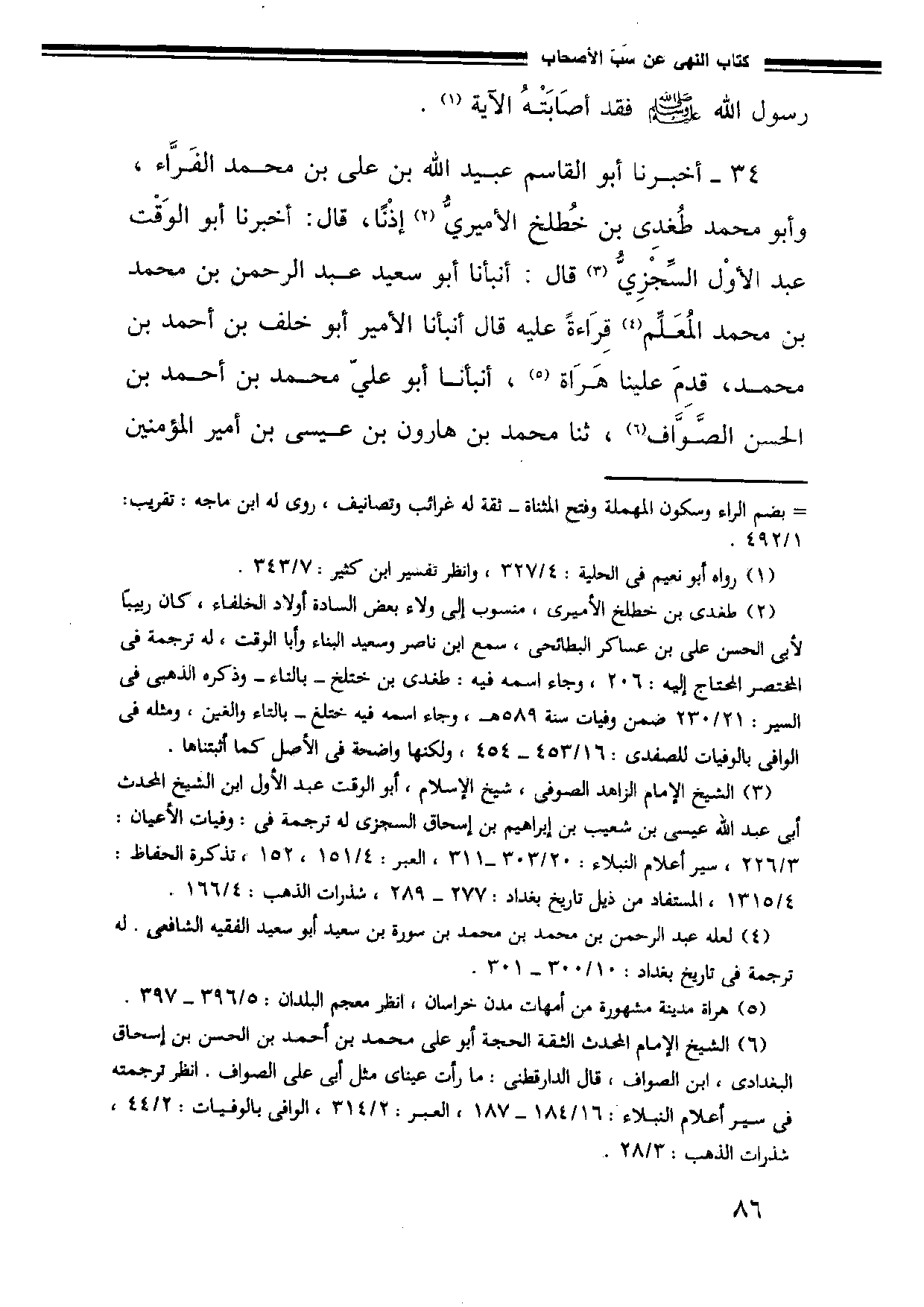 34 - أَخْبَرَنَا أَبُو الْقَاسِمِ عُبَيْدُ اللَّهِ بْنُ عَلِيِّ بْنِ مُحَمَّدٍ الْفَرَّاءُ وَأَبُو مُحَمَّدٍ طُغْدِي بْنُ خُطْلَخَ الأميري إذنا قَالَ أَخْبَرَنَا أَبُو الْوَقْتِ عَبْدُ الْأَوَّلِ السِّجْزِيُّ قَالَ أَنْبَأَنَا أبو سعيد عَبْدَ الرَّحْمَنِ بْنَ مُحَمَّدِ بْنِ مُحَمَّدٍ الْمُعَلِّمُ قِرَاءَةً عَلَيْهِ قَالَ أنبأنا الأمير أبوخلف بن أحمد بن محمد قدم علينا هراة أنبأنا أبو علي محمد بْنُ أَحْمَدَ بْنِ الْحَسَنِ الصَّوَّافُ ثَنَا مُحَمَّدُ بْنُ هَارُونَ بْنِ عِيسَى بْنِ أَمِيرِ الْمُؤْمِنِينَ -[87]- الْمَنْصُورِ قَالَ حَدَّثَنِي الْعَبَّاسُ بْنُ الْفَضْلِ أَبُو الْفَضْلِ الْهَاشِمِيُّ وَإِبْرَاهِيمُ بْنُ إِسْحَاقَ الشَّهِيدِيُّ قَالَا ثَنَا يَعْقُوبُ بْنُ حُمَيْدٍ قَالَ سَمِعْتُ سُفْيَانَ بْنَ عُيَيْنَةَ يَقُولُ