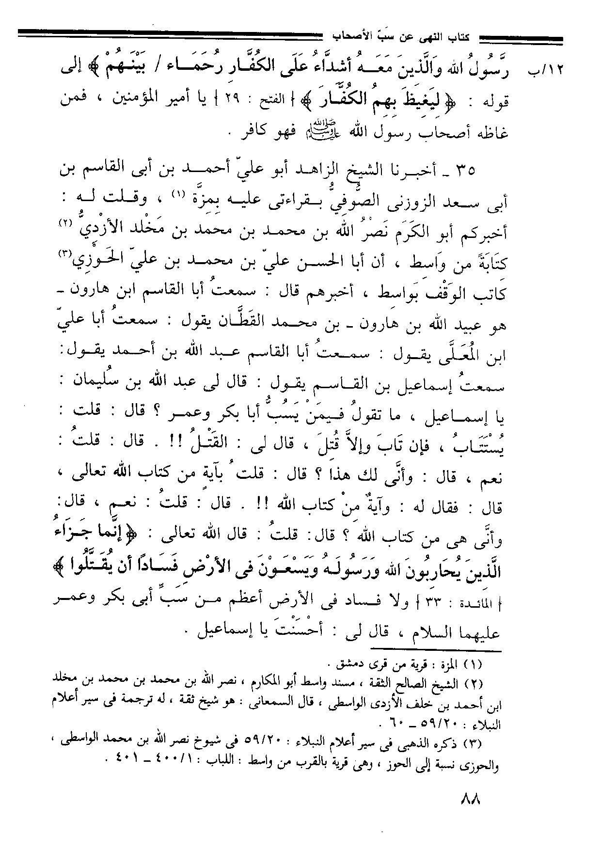 35 - أَخْبَرَنَا الشَّيْخُ الزَّاهِدُ أَبُو عَلِيٍّ أَحْمَدَ بْنِ أَبِي الْقَاسِمِ بْنِ أَبِي سَعْدٍ الزَّوْزَنِيُّ الصُّوفِيُّ بِقِرَاءَتِي عَلَيْهِ بِمِزَّةَ وَقُلْتُ لَهُ أَخْبَرَكُمْ أَبُو الْكَرَمِ نَصْرُ اللَّهِ بْنُ مُحَمَّدِ بْنِ مُحَمَّدِ بْنِ مَخْلَدٍ الْأَزْدِيُّ كِتَابَةً مِنْ وَاسِطٍ أَنَّ أَبَا الْحَسَنِ عَلِيَّ بْنَ مُحَمَّدِ بْنِ عَلِيٍّ الْحَوْزِيَّ كَاتِبَ الْوَقْفِ بِوَاسِطَ أَخْبَرَهُمْ قَالَ سَمِعْتُ أَبَا القاسم ابن هَارُونَ هُوَ عُبَيْدُ اللَّهِ بْنُ هَارُونَ بْنِ مُحَمَّدٍ الْقَطَّانُ يَقُولُ سمعت أبا علي بن الْمُعَلَّى يَقُولُ سَمِعْتُ أَبَا الْقَاسِمِ عَبْدَ اللَّهِ بْنَ أَحْمَدَ يَقُولُ سَمِعْتُ إِسْمَاعِيلَ بْنَ الْقَاسِمِ يَقُولُ قَالَ لِي عَبْدُ اللَّهِ بْنُ سُلَيْمَانَ يَا إِسْمَاعِيلَ مَا تَقُولُ فِيمَنْ يَسُبُّ أَبَا بَكْرٍ وَعُمَرَ قَالَ قُلْتُ يُسْتَتَابُ فَإِنْ تَابَ وَإِلَّا قُتِلَ قَالَ لِي الْقَتْلُ قَالَ قُلْتُ نَعَمْ قَالَ وَأَنَّى لك هذا قال قالت بِآيَةٍ مِنْ كِتَابِ اللَّهِ تَعَالَى قَالَ فَقَالَ لَهُ وَآيَةٌ مِنْ كِتَابِ اللَّهِ قَالَ قُلْتُ نَعَمْ قَالَ وَأَنَّى هِيَ مِنْ كِتَابِ اللَّهِ قَالَ قُلْتُ قَالَ اللَّهُ تَعَالَى: {إِنَّمَا جَزَاءُ الَّذِينَ يُحَارِبُونَ اللَّهَ وَرَسُولَهُ وَيَسْعَوْنَ فِي الأَرْضِ فسادا أن يقتلوا}. وَلَا فَسَادَ فِي الْأَرْضِ أَعْظَمُ مِنْ سَبِّ أَبِي بَكْرٍ وَعُمَرَ عَلَيْهِمَا السَّلَامُ قَالَ لِي أَحْسَنْتَ يَا إِسْمَاعِيلُ.