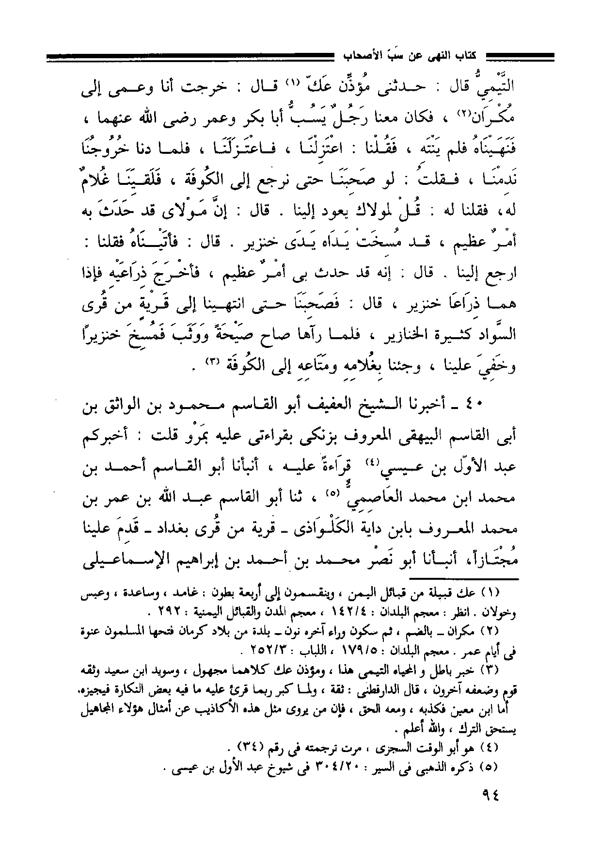 40 - أَخْبَرَنَا الشَّيْخُ الْعَفِيفُ أَبُو الْقَاسِمِ مَحْمُودُ بْنُ الْوَاثِقِ بْنِ أَبِي الْقَاسِمِ الْبَيْهَقِيُّ الْمَعْرُوفُ بِزَنْكِيٍّ بِقِرَاءَتِي عَلَيْهِ بِمَرْوَ قُلْتُ أَخْبَرَكُمْ عَبْدُ الْأَوَّلِ بْنُ عِيسَى قِرَاءَةً عَلَيْهِ أَنْبَأَنَا أَبُو الْقَاسِمِ أَحْمَدُ بْنُ محمد ابن مُحَمَّدٍ الْعَاصِمِيُّ ثَنَا أَبُو الْقَاسِمِ عَبْدُ اللَّهِ بْنُ عُمَرَ بْنِ محمد المعروف بابن داية الْكَلْوَاذِيُّ قَرْيَةٌ مِنْ قُرَى بَغْدَادَ قَدِمَ عَلَيْنَا مُجْتَازًا أَنْبَأَنَا أَبُو نَصْرٍ مُحَمَّدُ بْنُ أَحْمَدَ بْنِ إِبْرَاهِيمَ الْإِسْمَاعِيلِيُّ -[95]- بِجُرْجَانَ ثَنَا أَبُو حَبِيبٍ مُحَمَّدُ بْنُ أَحْمَدَ بْنِ مُوسَى حَدَّثَنِي مُحَمَّدُ بْنُ حُمَيْدٍ البزار حَدَّثَنِي أَيُّوبُ بْنُ الْحَسَنِ الْفَقِيهُ حَدَثَّنِي مَرْدَكٌ وَكَانَ ثِقَةً وَكَانَ يَبِيعُ السَّاجَ قَالَ