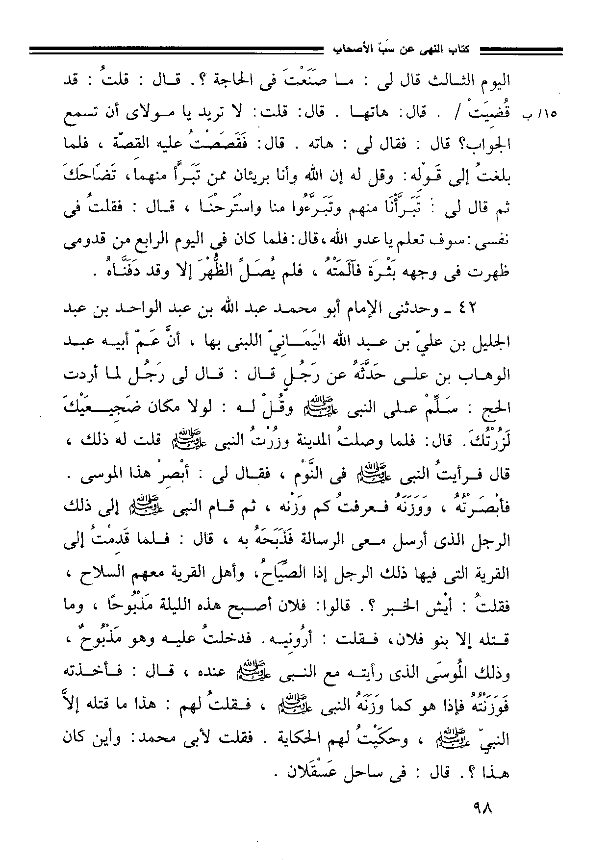 42 - وَحَدَّثَنِي الْإِمَامُ أَبُو مُحَمَّدٍ عَبْدُ اللَّهِ بْنُ عَبْدِ الْوَاحِدِ بْنِ عَبْدِ الْجَلِيلِ بْنِ عَلِيِّ بْنِ عَبْدِ اللَّهِ الْيَمَانِيُّ اللَّبَنِيُّ بِهَا أَنَّ عَمَّ أَبِيهِ عَبْدَ الْوَهَّابِ بْنَ عَلِيٍّ حَدَّثهُ عَنْ رَجُلٍ قَالَ قَالَ لِي رَجُلٌ لَمَّا أَرَدْتُ الْحَجَّ سَلِّمْ عَلَى النَّبِيِّ صَلَّى اللَّهُ عَلَيْهِ وَسَلَّمَ وَقُلْ لَهُ لَوْلَا مَكَانُ ضَجِيعَيْكَ لَزُرْتُكَ قَالَ فَلَمَّا وَصَلْتُ الْمَدِينَةَ وَزُرْتُ النَّبِيِّ صَلَّى اللَّهُ عَلَيْهِ وَسَلَّمَ قُلْتُ لَهُ ذَلِكَ قَالَ فَرَأَيْتُ النَّبِيِّ صَلَّى اللَّهُ عَلَيْهِ وَسَلَّمَ فِي النَّوْمِ فَقَالَ لِي أَبْصِرْ هَذَا الْمُوسَى فَأَبْصَرْتُهُ وَوَزَنَهُ فَعَرَفْتُ كَمْ وَزْنُهُ ثُمَّ قَامَ النَّبِيُّ صَلَّى اللَّهُ عَلَيْهِ وَسَلَّمَ إِلَى ذَلِكَ الرَّجُلِ الَّذِي أَرْسَلَ مَعِيَ الرسالة فذبحه به