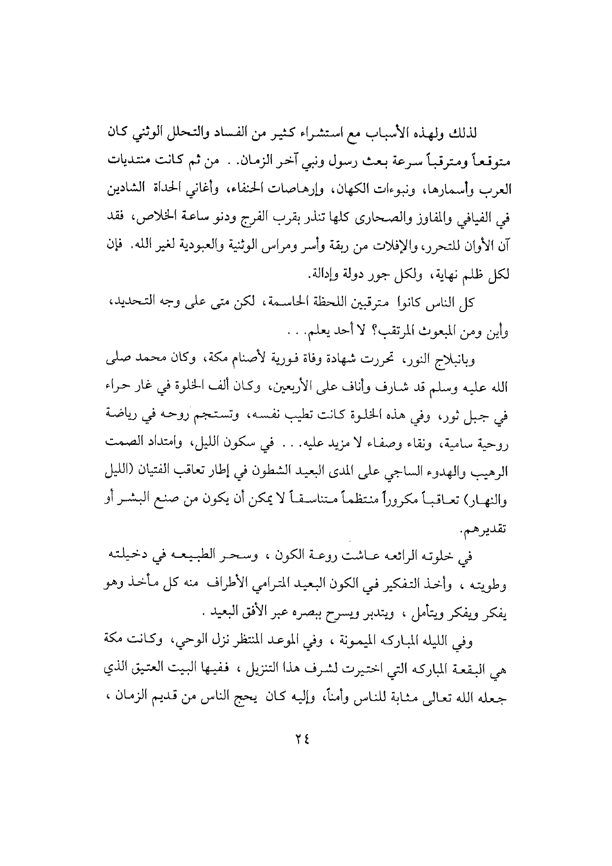وبانبلاج النور، تحررت شهادة وفاة فورية لأصنام مكة، وكان محمد صلى الله عليه وسلم قد شارف وأناف على الأربعين، وكان ألف الخلوة في غار حراء في جبل ثور، وفي هذه الخلوة كانت تطيب نفسه، وتستجم روحه في رياضة روحية سامية، ونقاء وصفاء لا مزيد عليه ... في سكون الليل، وامتداد الصمت الرهيب والهدوء الساجي على المدى البعيد الشطون في إطار تعاقب الفتيان (الليل والنهار) تعاقبا مكرورا منتظما متناسقا لا يمكن أن يكون من صنع البشر أو تقديرهم.