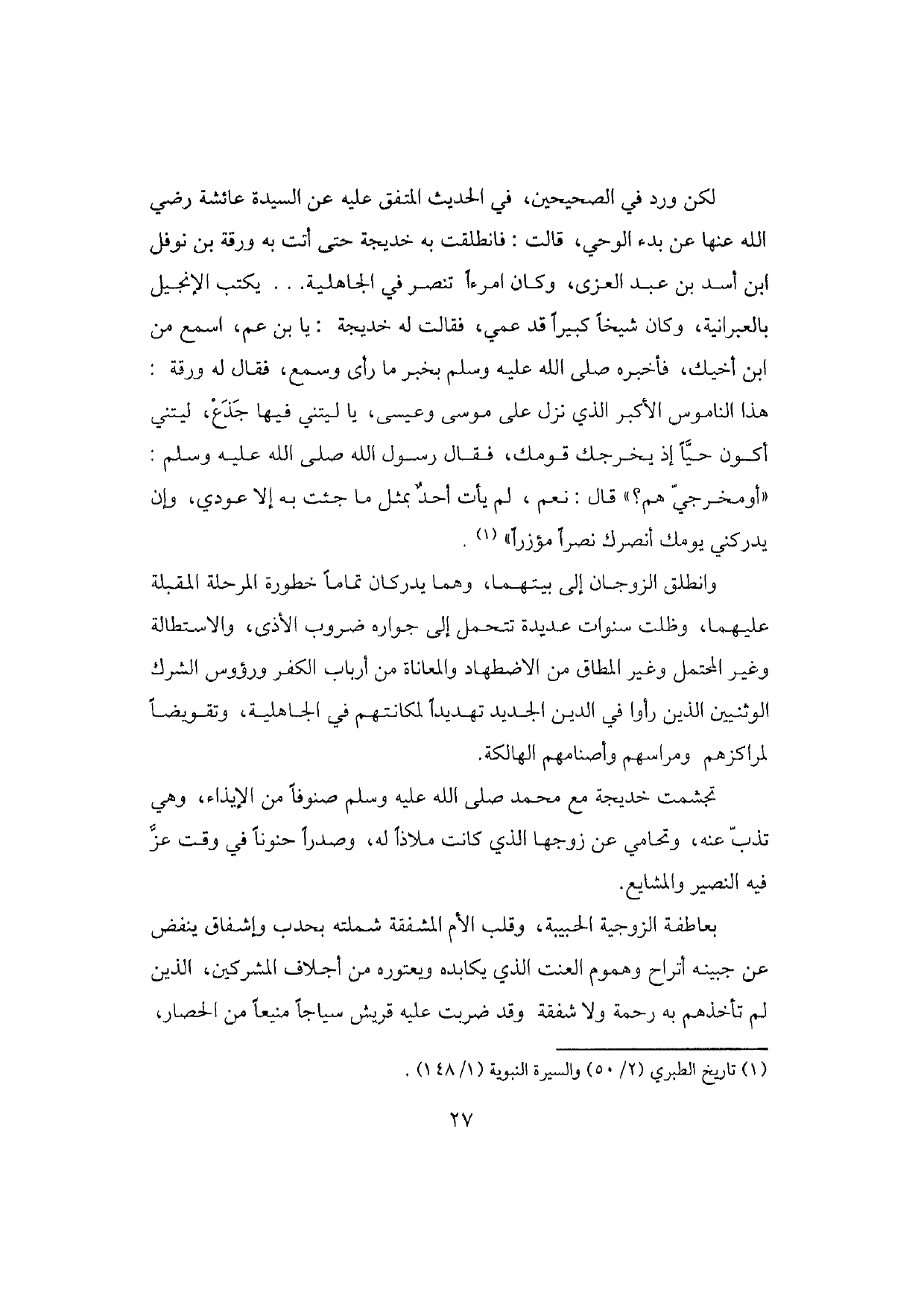 بعاطفة الزوجية الحبيبة، وقلب الأم المشفقة شملته بحدب وإشفاق ينفض عن جبينه أتراح وهموم العنت الذي يكابده ويعتوره من أجلاف المشركين، الذين لم تأخذهم به رحمة ولا شفقة وقد ضربت عليه قريش سياجا منيعا من الحصار،