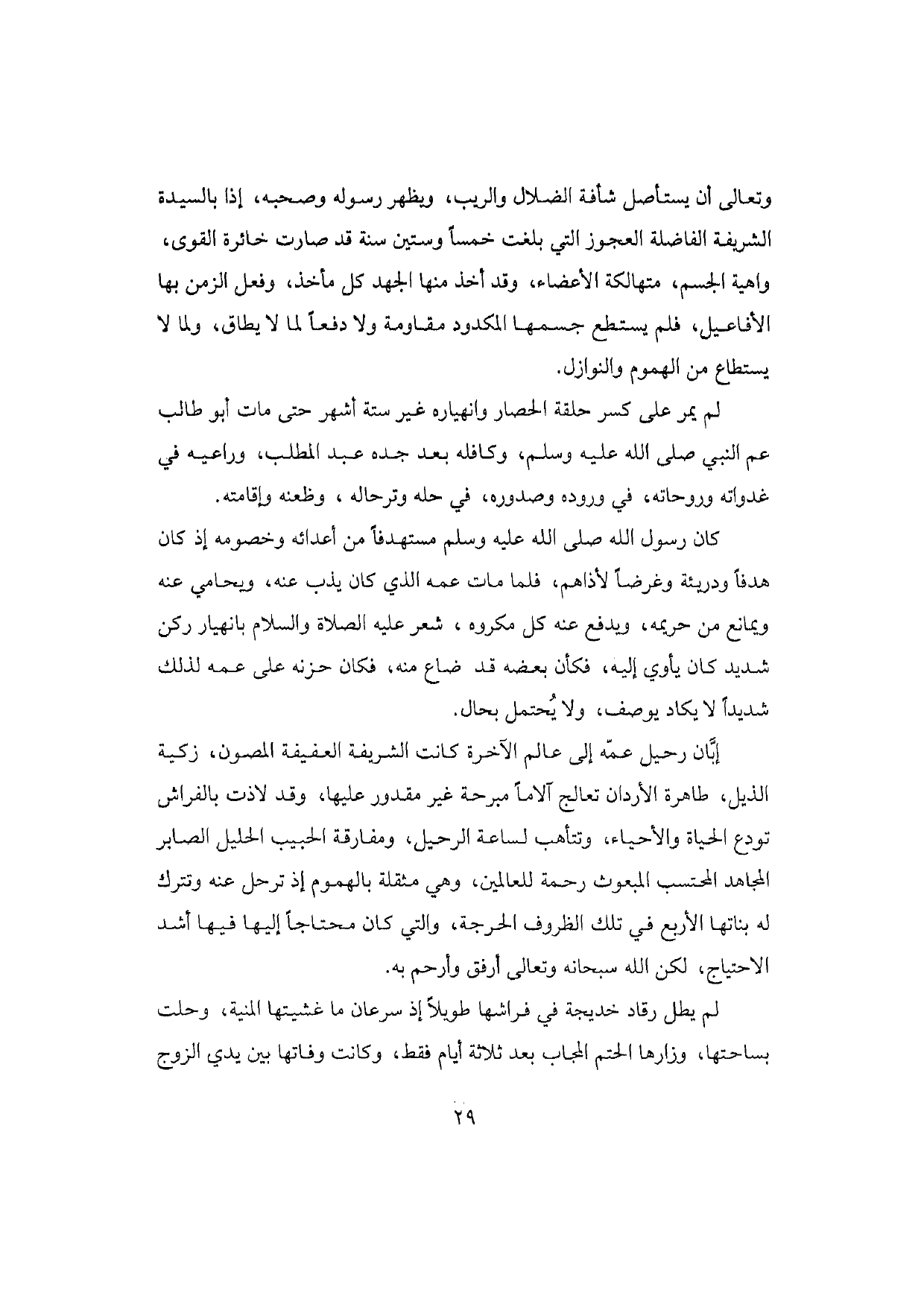 وتعالى أن يستأصل شأفة الضلال والريب، ويظهر رسوله وصحبه، إذا بالسيدة الشريفة الفاضلة العجوز التي بلغت خمسا وستين سنة قد صارت خائرة القوى، واهية الجسم، متهالكة الأعضاء، وقد أخذ منها الجهد كل مأخذ، وفعل الزمن بها الأفاعيل، فلم يستطع جسمها المكدود مقاومة ولا دفعا لما لا يطاق، ولما لا يستطاع من الهموم والنوازل.