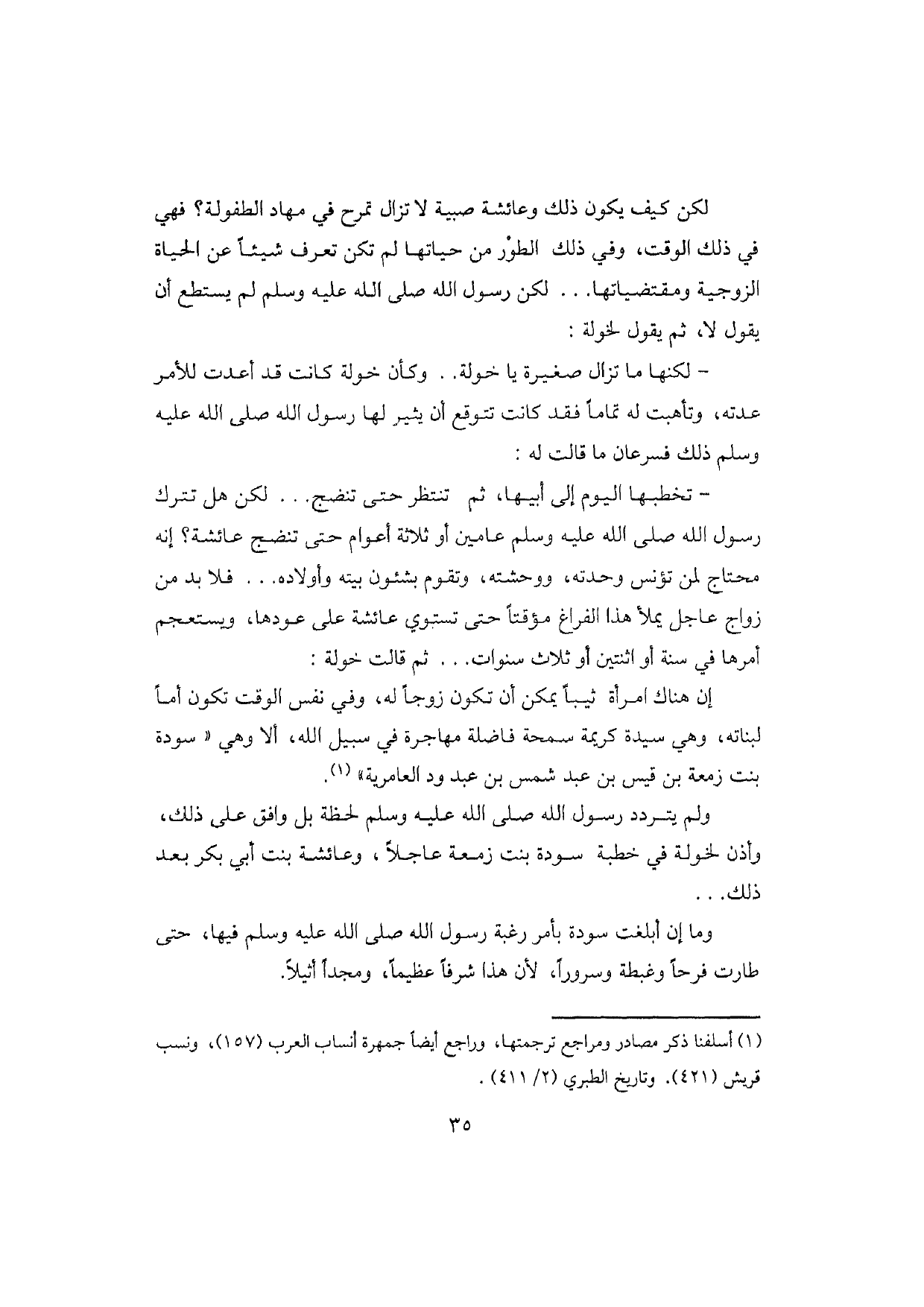 - لكنها ما تزال صغيرة يا خولة.. وكأن خولة كانت قد أعدت للأمر عدته، وتأهبت له تماما فقد كانت تتوقع أن يثير لها رسول الله صلى الله عليه وسلم ذلك فسرعان ما قالت له:
