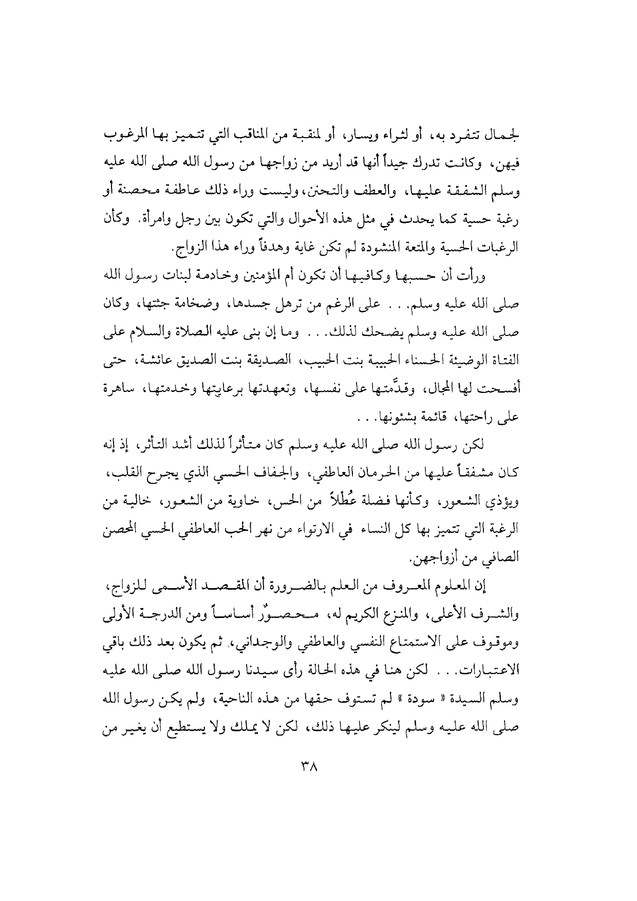 إن المعلوم المعروف من العلم بالضرورة أن المقصد الأسمى للزواج، والشرف الأعلى، والمنزع الكريم له، محصور أساسا ومن الدرجة الأولى وموقوف على الاستمتاع النفسي والعاطفي والوجداني، ثم يكون بعد ذلك باقي الاعتبارات ... لكن هنا في هذه الحالة رأى سيدنا رسول الله صلى الله عليه وسلم السيدة «سودة» لم تستوف حقها من هذه الناحية، ولم يكن رسول الله صلى الله عليه وسلم لينكر عليها ذلك، لكن لا يملك ولا يستطيع أن يغير من