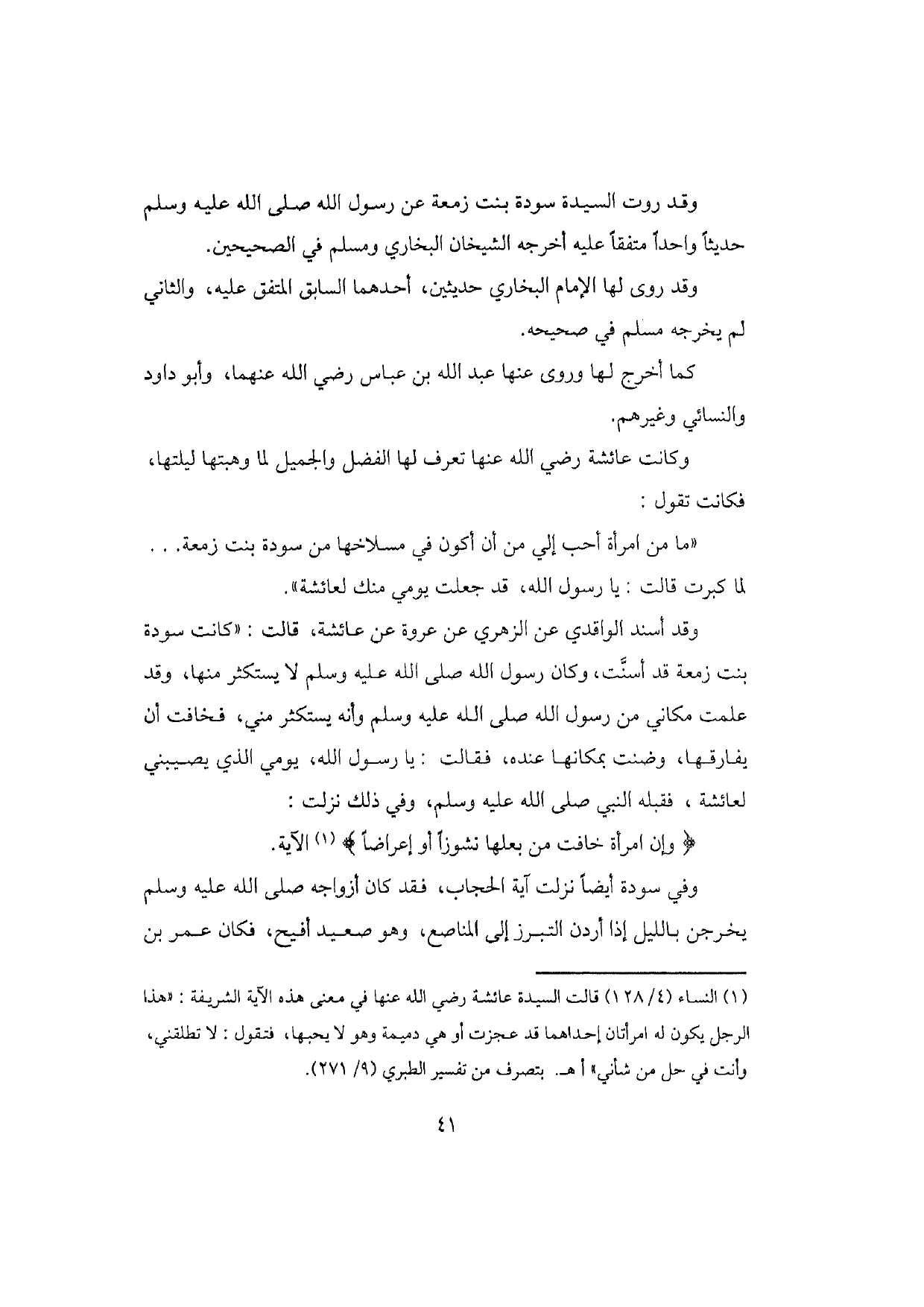 وقد أسند الواقدي عن الزهري عن عروة عن عائشة، قالت: «كانت سودة بنت زمعة قد أسنّت، وكان رسول الله صلى الله عليه وسلم لا يستكثر منها، وقد علمت مكاني من رسول الله صلى الله عليه وسلم وأنه يستكثر مني، فخافت أن يفارقها، وضنت بمكانها عنده، فقالت: يا رسول الله، يومي الذي يصيا بني لعائشة، فقبله النبي صلى الله عليه وسلم، وفي ذلك نزلت: