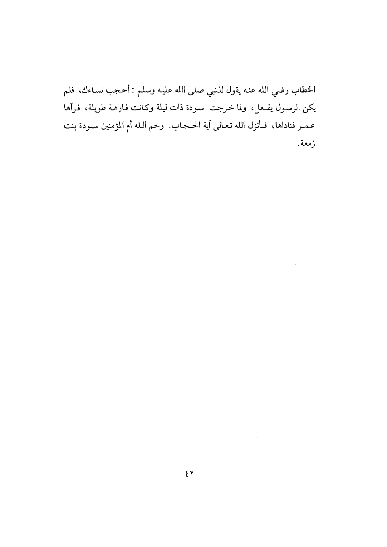 الخطاب رضي الله عنه يقول للنبي صلى الله عليه وسلم: أحجب نساءك، فلم يكن الرسول يفعل، ولما خرجت سودة ذات ليلة وكانت فارهة طويلة، فرآها عمر فناداها، فأنزل الله تعالى آية الحجاب. رحم الله أم المؤمنين سودة بنت زمعة.