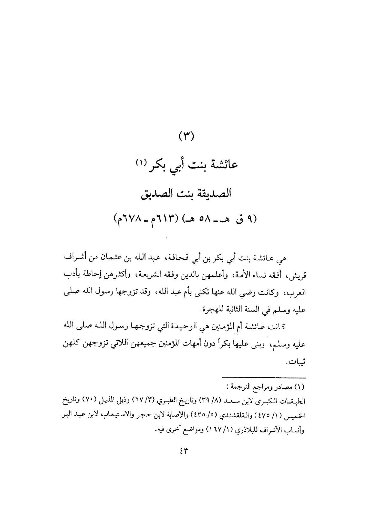 (3) عائشة بنت أبي بكر «1» الصديقة بنت الصديق (9 ق هـ- 58 هـ) (613 م- 678 م)