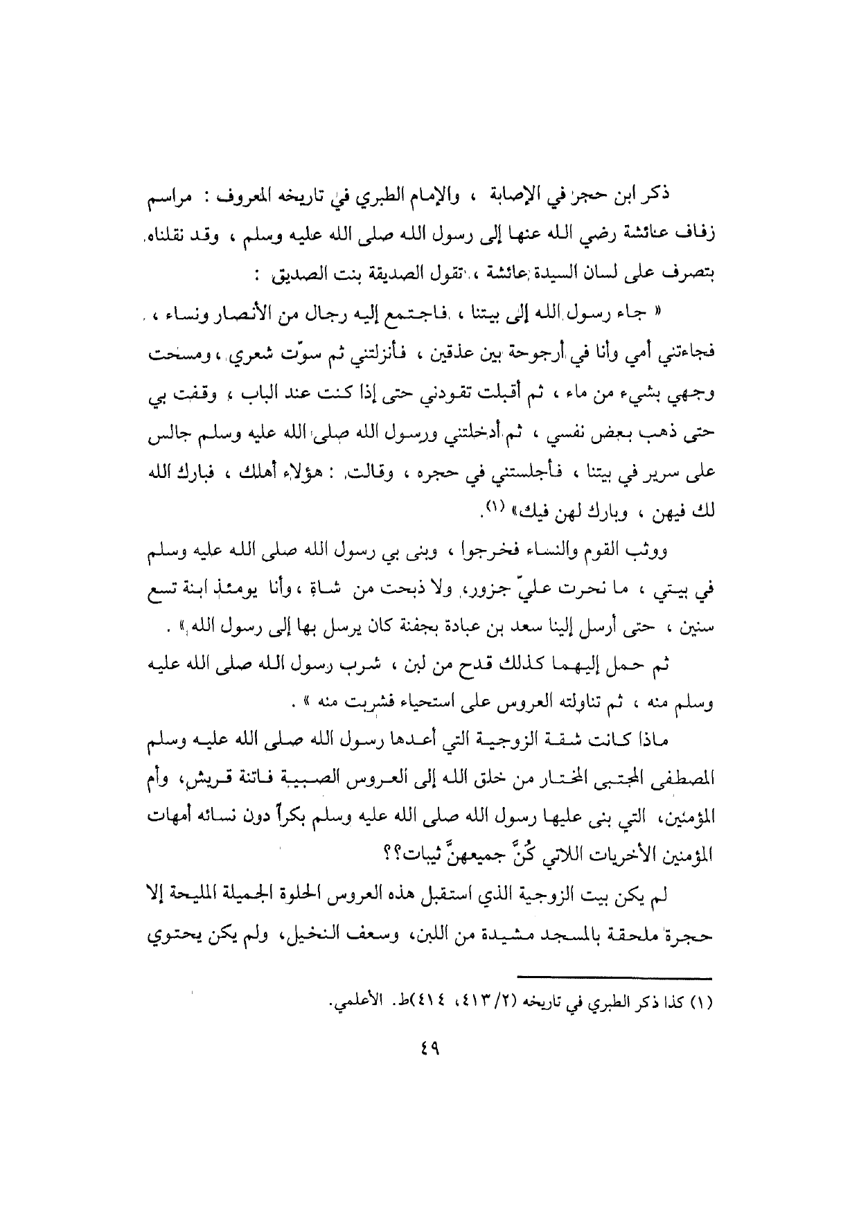 ذكر ابن حجر في الإصابة، والإمام الطبري في تاريخه المعروف: مراسم زفاف عائشة رضي الله عنها إلى رسول الله صلى الله عليه وسلم، وقد نقلناه بتصرف على لسان السيدة عائشة، تقول الصديقة بنت الصديق: