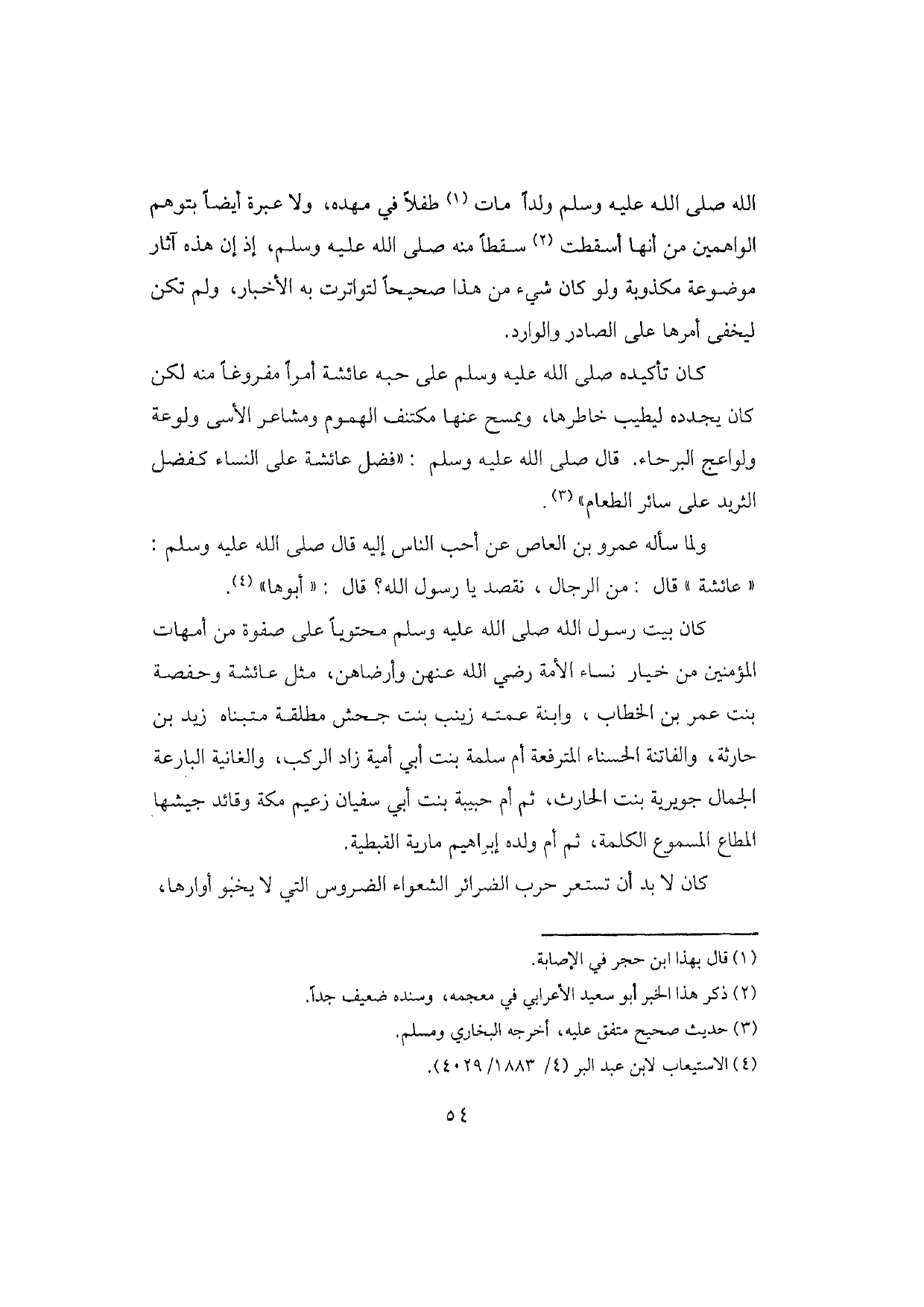 الله صلى الله عليه وسلم ولدا مات «1» طفلا في مهده، ولا عبرة أيضا بتوهم الواهمين من أنها أسقطت «2» سقطا منه صلى الله عليه وسلم، إذ إن هذه آثار موضوعة مكذوبة ولو كان شيء من هذا صحيحا لتواترت به الأخبار، ولم تكن ليخفى أمرها على الصادر والوارد.