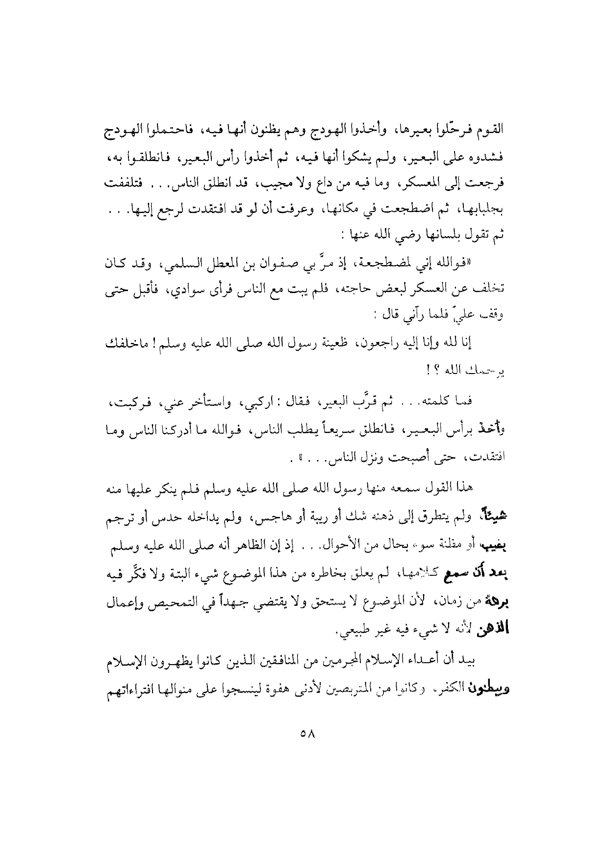 فما كلمته ... ثم قرّب البعير، فقال: اركبي، واستأخر عني، فركبت، وأخذ برأس البعير، فانطلق سريعا يطلب الناس، فو الله ما أدركنا الناس وما افتقدت، حتى أصبحت ونزل الناس ... » .