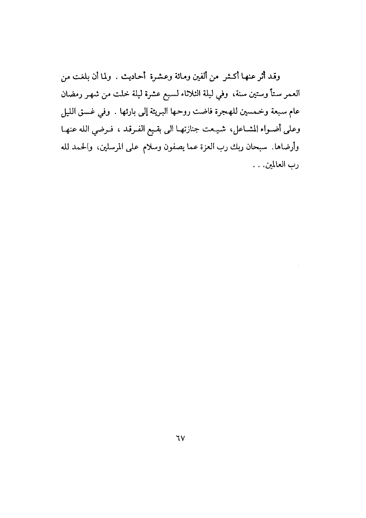 وقد أثر عنها أكثر من ألفين ومائة وعشرة أحاديث. ولما أن بلغت من العمر ستا وستين سنة، وفي ليلة الثلاثاء لسبع عشرة ليلة خلت من شهر رمضان عام سبعة وخمسين للهجرة فاضت روحها البريئة إلى بارئها. وفي غسق الليل وعلى أضواء المشاعل، شيعت جنازتها الى بقيع الفرقد، فرضي الله عنها وأرضاها. سبحان ربك رب العزة عما يصفون وسلام على المرسلين، والحمد لله رب العالمين ...