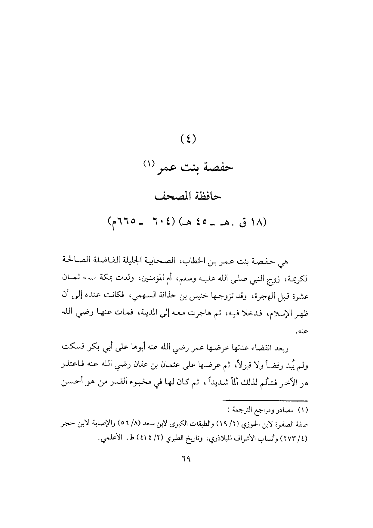 (4) حفصة بنت عمر «1» حافظة المصحف (18 ق. هـ- 45 هـ) (604- 665 م)