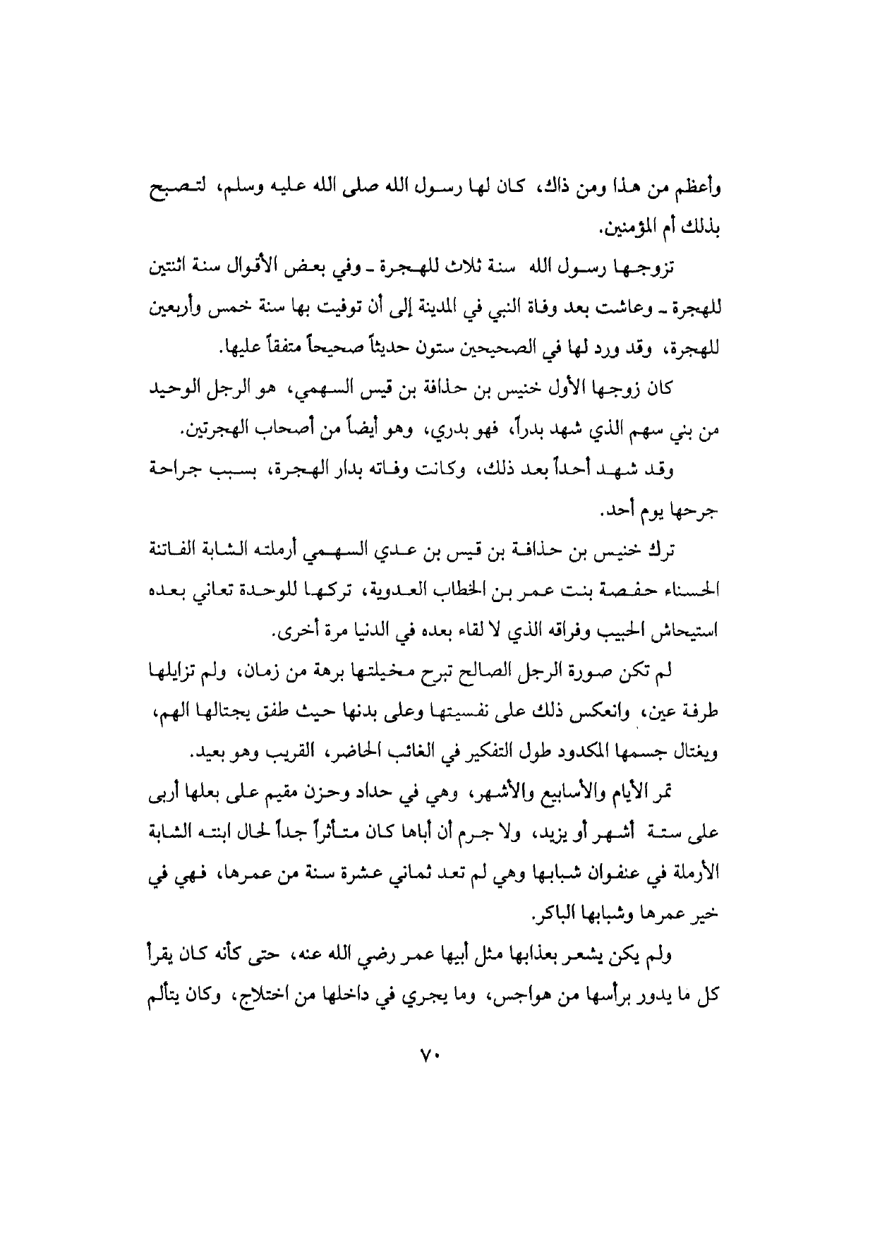ولم يكن يشعر بعذابها مثل أبيها عمر رضي الله عنه، حتى كأنه كان يقرأ كل ما يدور برأسها من هواجس، وما يجري في داخلها من اختلاج، وكان يتألم