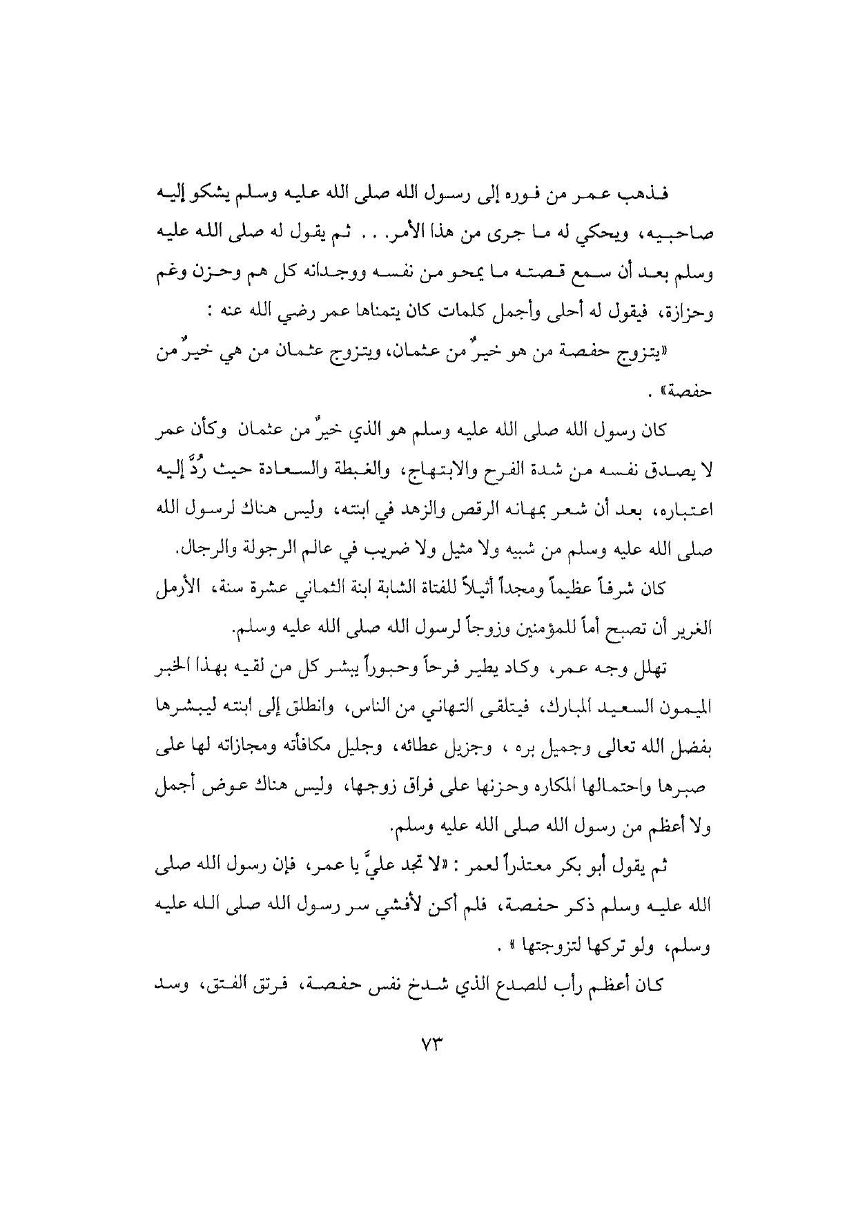 تهلل وجه عمر، وكاد يطير فرحا وحبورا يبشر كل من لقيه بهذا الخبر الميمون السعيد المبارك، فيتلقى التهاني من الناس، وانطلق إلى ابنته ليبشرها بفضل الله تعالى وجميل بره، وجزيل عطائه، وجليل مكافأته ومجازاته لها على صبرها واحتمالها المكاره وحزنها على فراق زوجها، وليس هناك عوض أجمل ولا أعظم من رسول الله صلى الله عليه وسلم.