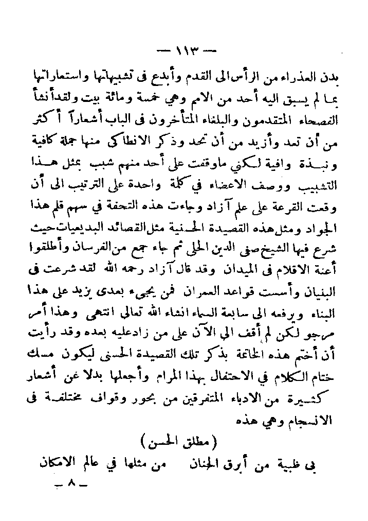 بدن العذراء من الرأس إلى القدم، وأبدع في تشبيهاتها واستعاراتها بما لم يسبق إليه أحد من الأمم، وهي خمسة ومئة بيت. ولقد أنشأ الفصحاء المتقدمون والبلغاء المتأخرون في الباب أشعارا أكثر من أن تعد، وأزيد من أن تحد، وذكر الأنطاكي منها جملة كافية، ونبذة وافية، لكني ما وقفت على أحد منهم شبب بمثل هذا التشبيب، ووصف الأعضاء في كلمة واحدة لا على الترتيب، إلى أن وقعت القرعة على علم آزاد، وجاءت هذه التحفة في سهم قلم هذا الجواد، ومثل هذه القصيدة الحسنية مثل القصائد البديعيات، حيث شرع فيها الشيخ صفي الدين الحلي، ثم جاء جمع من الفرسان، وأطلقوا أعنة الأقلام في الميدان، وقد قال آزاد رحمه الله: لقد شرعت في البنيان، وأسست قواعد العمران، فمن يجيء بعدي يزيد على هذا البناء، ويرفعه على سابعة السماء إن شاء الله تعالى. انتهى. وهذا أمر مرجو، لكن لم أقف إلى الآن على من زاد عليه بعده، وقد رأيت أن أختم هذه الخاتمة بذكر تلك القصيدة الحسنى، ليكون مسك ختام الكلام، في هذا الاحتفال في هذا المرام، وأجعلها بدلا عن أشعار كثيرة من الأدباء المتفرقين من بحور وقواف مختلفة في الانسجام، وهي هذه: