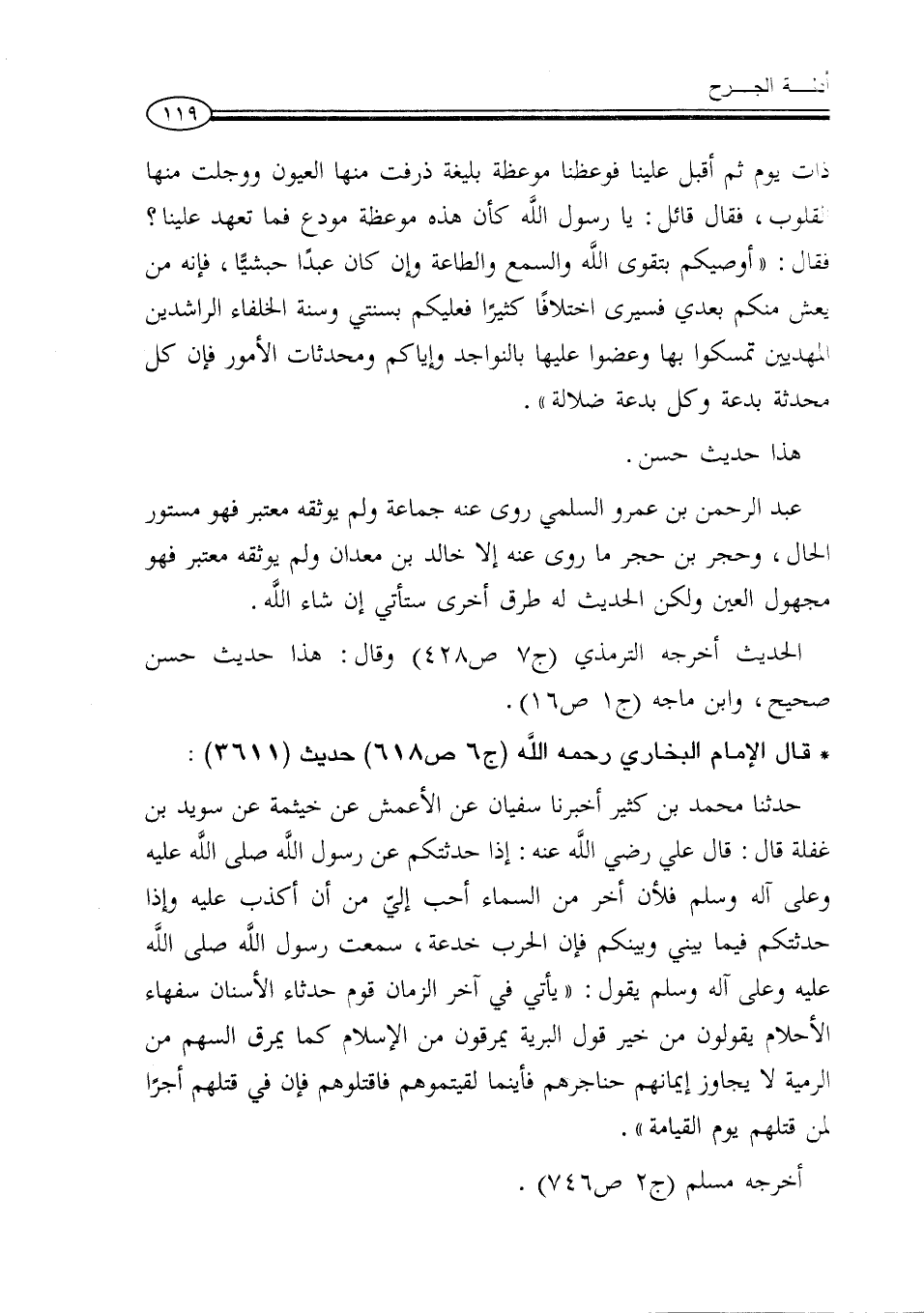 ذات يوم ثم أقبل علينا فوعظنا موعظة بليغة ذرفت منها العيون ووجلت منها القلوب، فقال قائل: يا رسول الله كأن هذه موعظة مودع فماذا تعهد إلينا؟ فقال: «أوصيكم بتقوى الله والسمع والطاعة وإن كان عبداً حبشياً، فإنه من يعش منكم بعدي فسيرى اختلافاً كثيراً فعليكم بسنتي وسنة الخلفاء الراشدين المهديين تمسكوا بها وعضوا عليها بالنواجذ وإياكم ومحدثات الأمور فإن كل محدثة بدعة وكل بدعة ضلالة».