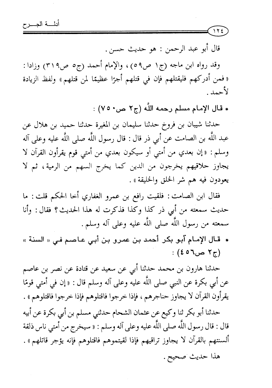 حدثنا شيبان بن فروخ حدثنا سليمان بن المغيرة حدثنا حميد بن هلال عن عبد الله بن الصامت عن أبي ذر قال: قال رسول الله صلى الله عليه وعلى آله وسلم: «إن بعدي من أمتي أو سيكون بعدي من أمتي قوم يقرءون القرآن لا يجاوز حلاقيمهم يخرجون من الدين كما يخرج السهم من الرمية، ثم لا يعودون فيه هم شر الخلق والخليقة».