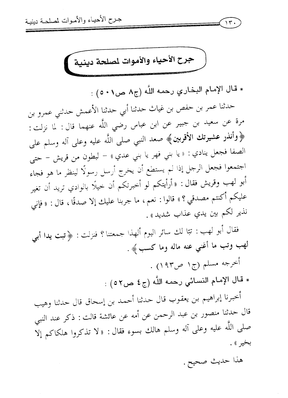 حدثنا عمر بن حفص بن غياث حدثنا أبي حدثنا الأعمش حدثني عمرو بن مرة عن سعيد بن جبير عن ابن عباس رضي الله عنهما قال: لما نزلت: {وَأَنذِرْ عَشِيرَتَكَ الْأَقْرَبِينَ} صعد النبي صلى الله عليه وعلى آله وسلم على الصفا فجعل ينادي: «يا بني فهر يا بني عدي» - لبطون من قريش - حتى اجتمعوا فجعل الرجل إذا لم يستطع أن يخرج أرسل رسولاً لينظر ما هو فجاء أبو لهب وقريش فقال: «أرأيتكم لو أخبرتكم أن خيلاً بالوادي تريد أن تغير عليكم أكنتم مصدقي؟» قالوا: نعم، ما جربنا عليك إلا صدقاً، قال: «فإني نذير لكم بين يدي عذاب شديد»، فقال أبو لهب: تباً لك سائر اليوم ألهذا جمعتنا؟ فنزلت: {تَبَّتْ يَدَا أَبِي لَهَبٍ وَتَبَّ (1) مَا أَغْنَى عَنْهُ مَالُهُ وَمَا كَسَبَ}.