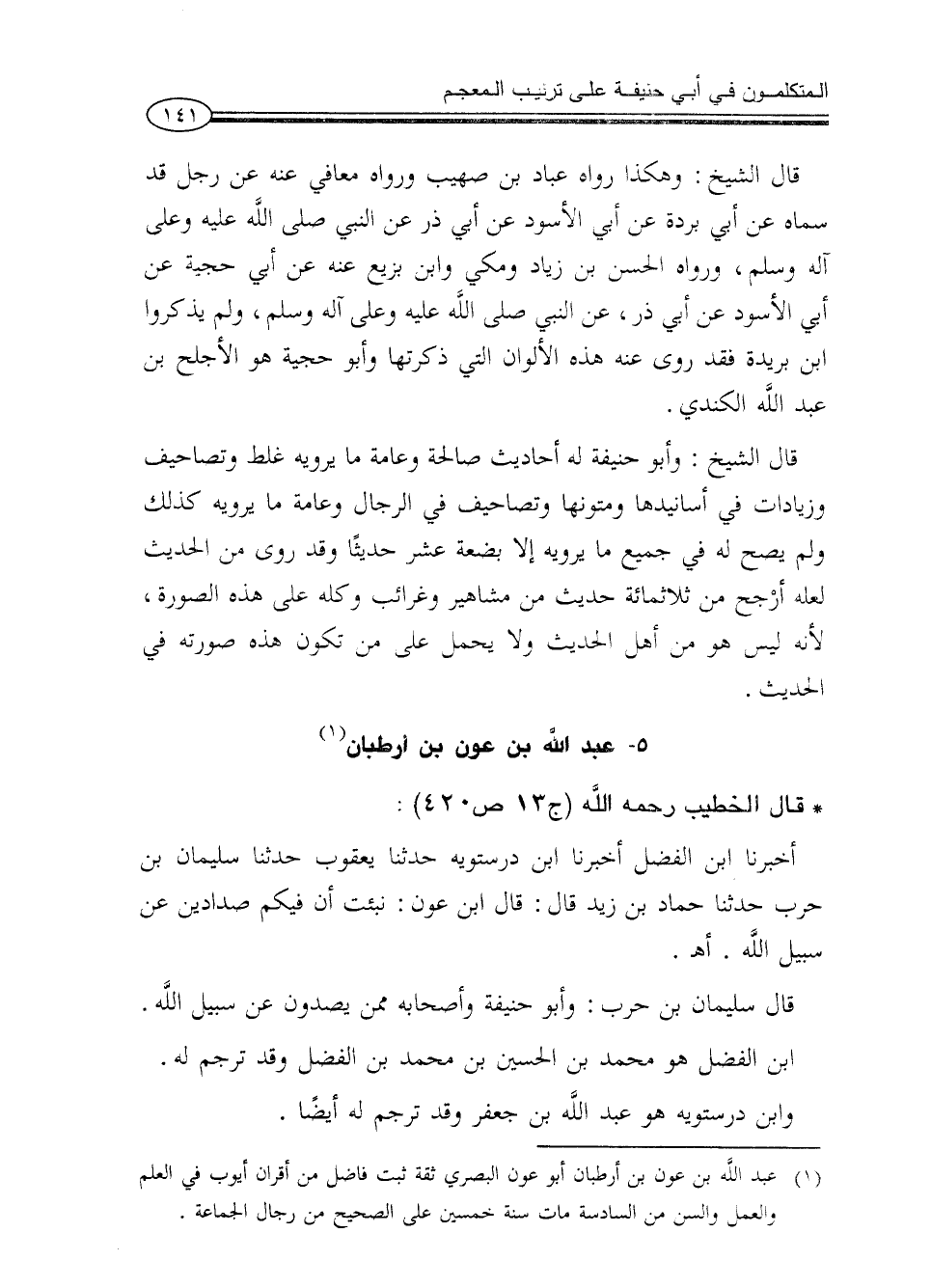(¬1) عبد الله بن عون بن أرطبان أبو عون البصري ثقة ثبت فاضل من أقران أيوب في العلم والعمل والسن من السادسة مات سنة خمسين على الصحيح من رجال الجماعة.