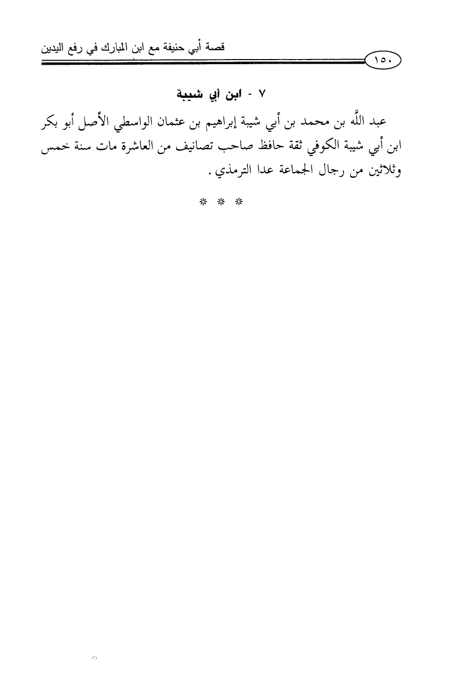 عبد الله بن محمد بن أبي شيبة إبراهيم بن عثمان الواسطي الأصل أبو بكر ابن أبي شيبة الكوفي ثقة حافظ صاحب تصانيف من العاشرة مات سنة خمس وثلاثين من رجال الجماعة عدا الترمذي.
