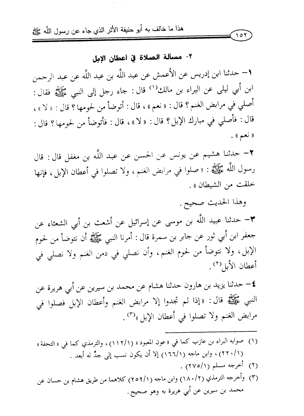 1 - حدثنا ابن إدريس عن الأعمش عن عبد الله بن عبد الله عن عبد الرحمن ابن أبي ليلى عن البراء بن مالك (¬1) قال: جاء رجل إلى النبي - صلى الله عليه وسلم - فقال: أصلي في مرابض الغنم؟ قال: «نعم»، قال: أتوضأ من لحومها؟ قال: «لا»، قال: فأصلي في مبارك الإبل؟ قال: «لا»، قال: فأتوضأ من لحومها؟ قال: