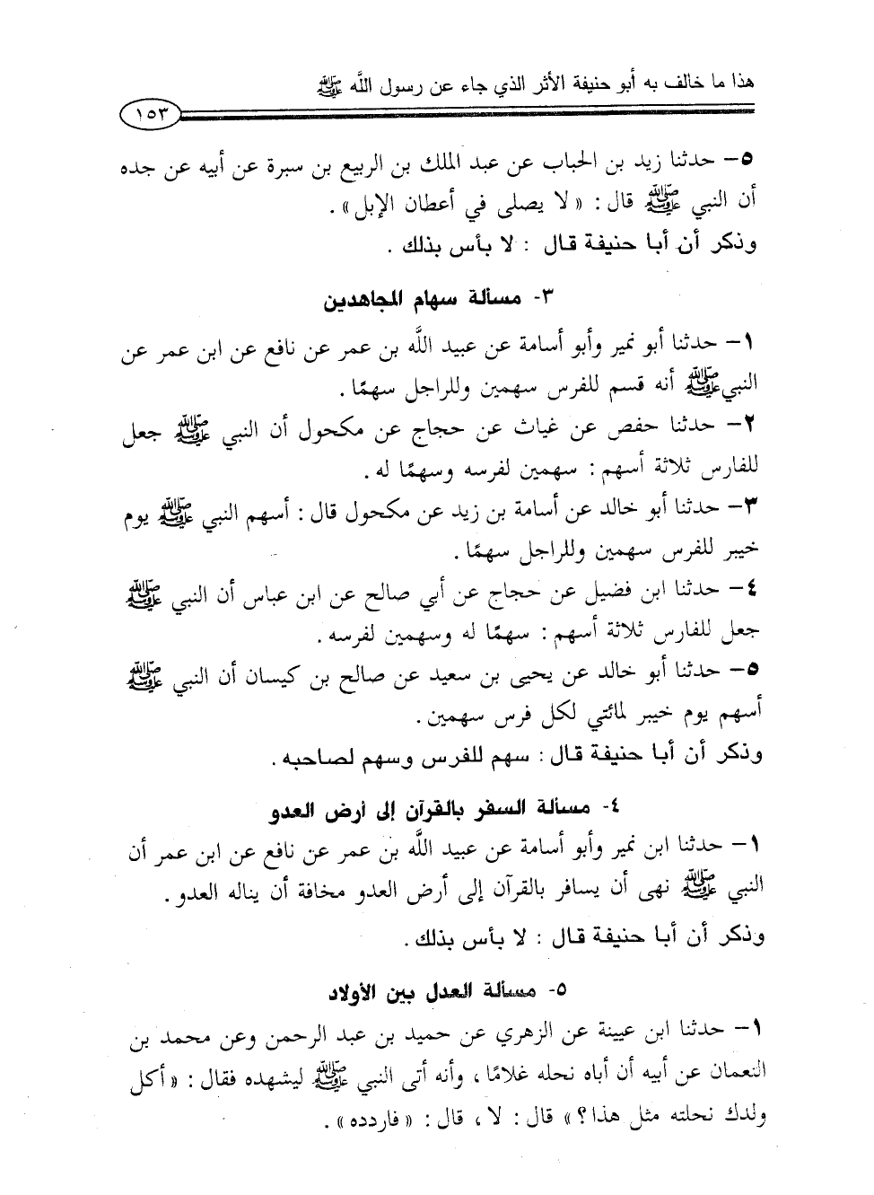 1 - حدثنا أبو نمير وأبو أسامة عن عبيد الله بن عمر عن نافع عن ابن عمر عن النبي - صلى الله عليه وسلم - أنه قسم للفرس سهمين وللراجل سهماً.