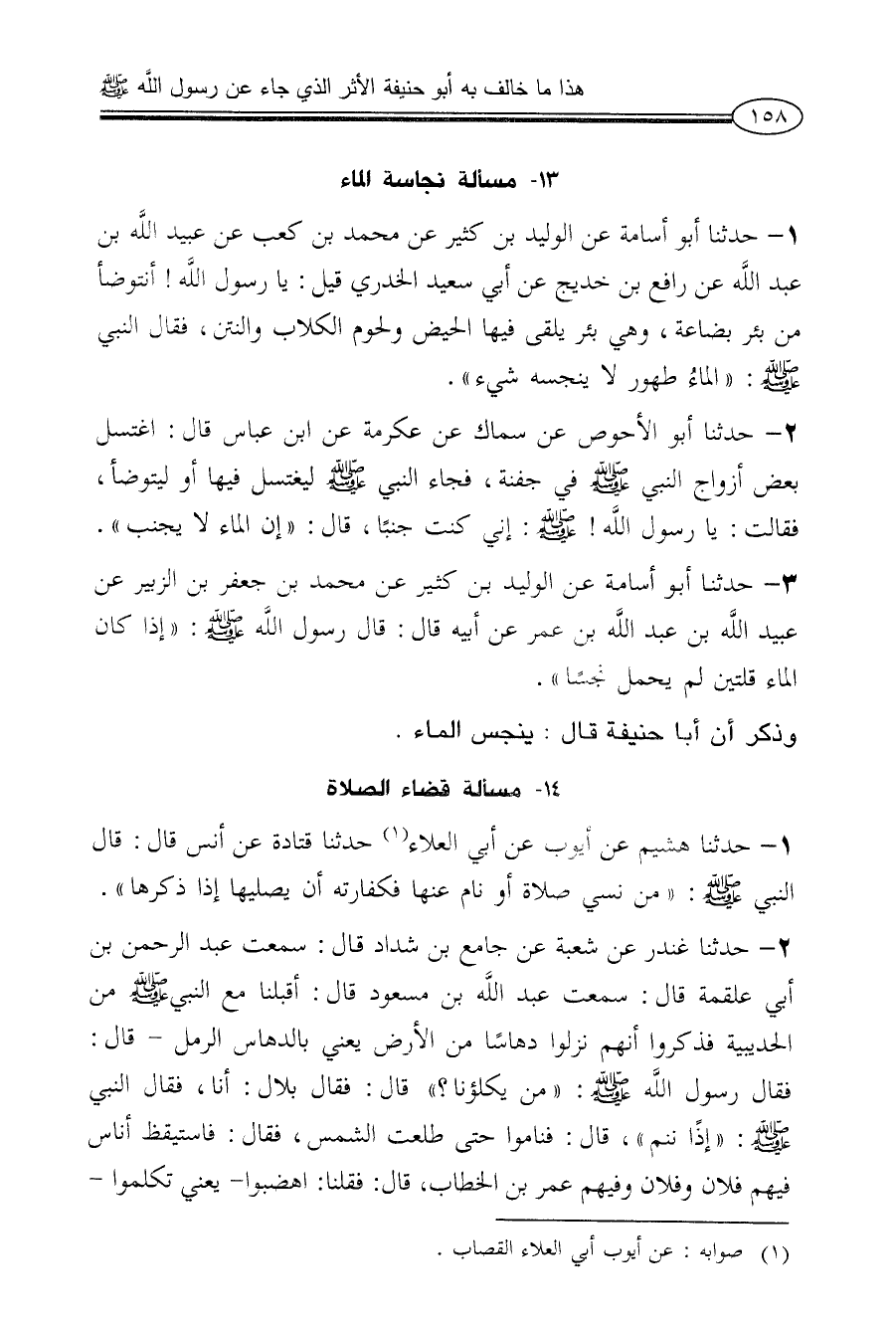 1 - حدثنا أبو أسامة عن الوليد بن كثير عن محمد بن كعب عن عبيد الله بن عبد الله عن رافع بن خديج عن أبي سعيد الخدري قيل: يا رسول الله! أنتوضأ من بئر بضاعة، وهي بئر يلقى فيها الحيض ولحوم الكلاب والنتن، فقال النبي - صلى الله عليه وسلم -: «الماءُ طهور لا ينجسه شيء».