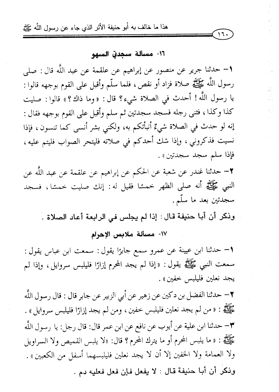 1 - حدثنا جرير عن منصور عن إبراهيم عن علقمة عن عبد الله قال: صلى رسول الله - صلى الله عليه وسلم - صلاة فزاد أو نقص، فلما سلّم وأقبل على القوم بوجهه