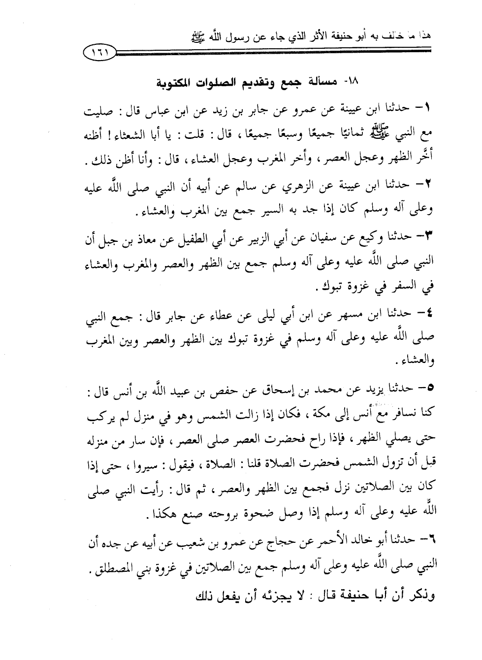 4 - حدثنا ابن مسهر عن ابن أبي ليلى عن عطاء عن جابر قال: جمع النبي صلى الله عليه وعلى آله وسلم في غزوة تبوك بين الظهر والعصر وبين المغرب والعشاء.