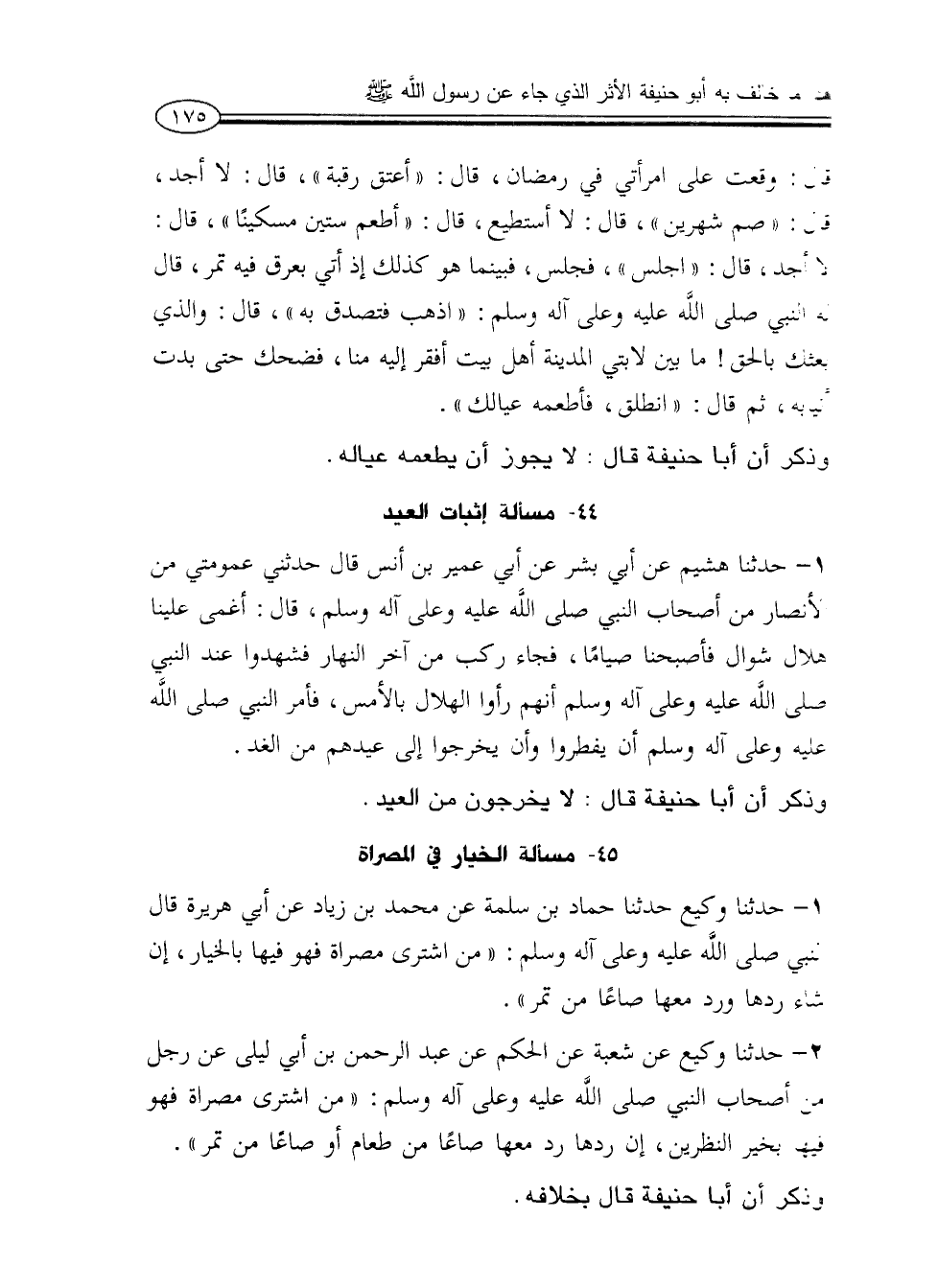 1 - حدثنا هشيم عن أبي بشر عن أبي عمير بن أنس قال حدثني عمومتي من الأنصار من أصحاب النبي صلى الله عليه وعلى آله وسلم، قال: «أغمي علينا هلال شوال فأصبحنا صياماً، فجاء ركب من آخر النهار فشهدوا عند النبي صلى الله عليه وعلى آله وسلم أنهم رأوا الهلال بالأمس، فأمر النبي صلى الله عليه وعلى آله وسلم أن يفطروا وأن يخرجوا إلى عيدهم من الغد.