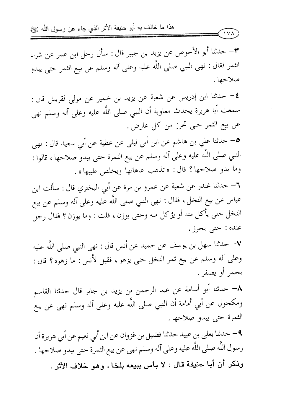 3 - حدثنا أبو الأحوص عن يزيد بن جبير قال: سأل رجل ابن عمر عن شراء الثمر فقال: نهى النبي صلى الله عليه وعلى آله وسلم عن بيع الثمر حتى يبدو صلاحها.