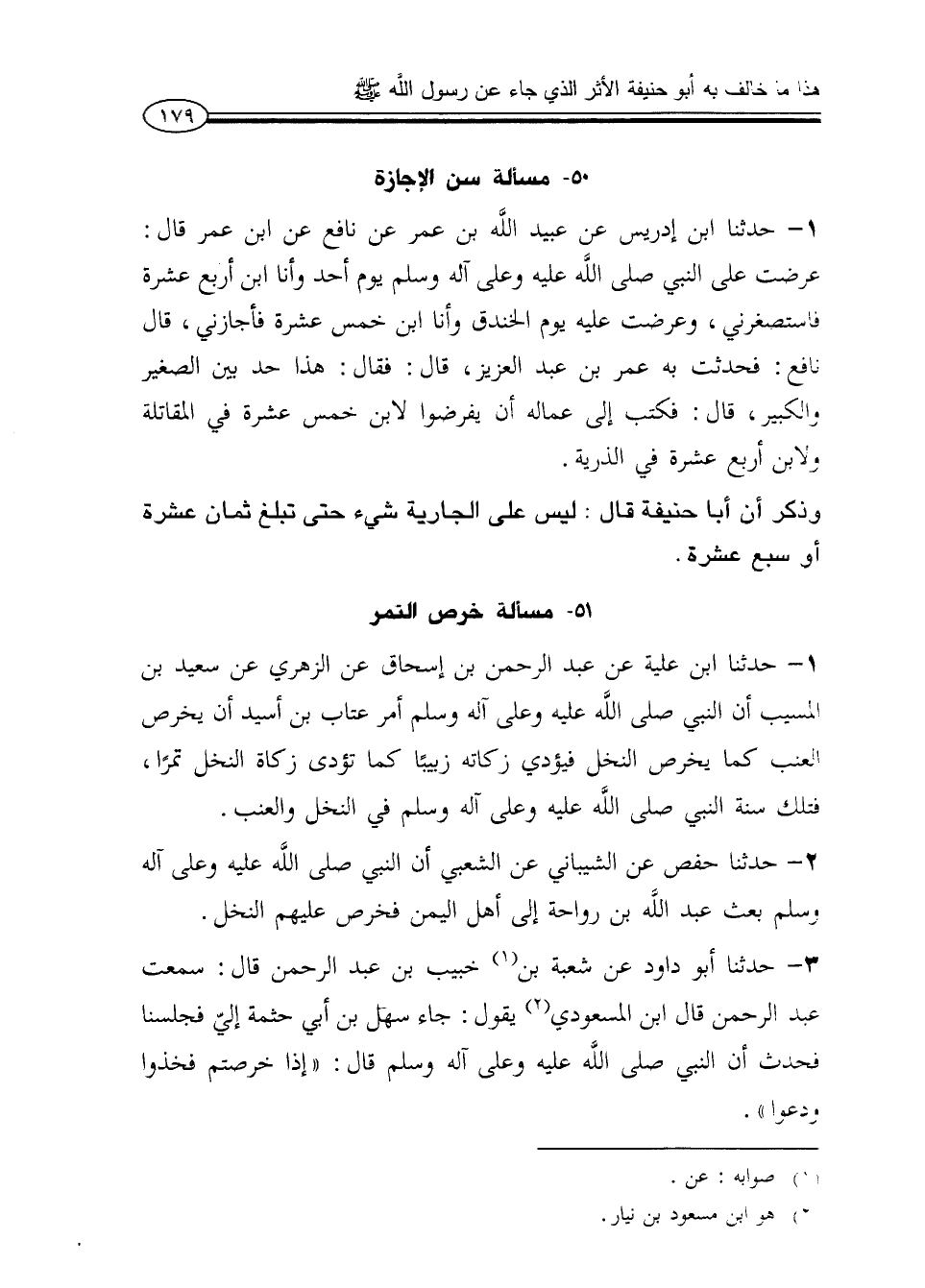 1 - حدثنا ابن إدريس عن عبيد الله بن عمر عن نافع عن ابن عمر قال: عرضت على النبي صلى الله عليه وعلى آله وسلم يوم أحد وأنا ابن أربع عشرة فاستصغرني، وعرضت عليه يوم الخندق وأنا ابن خمس عشرة فأجازني، قال نافع: فحدثت به عمر بن عبد العزيز، قال: فقال: هذا حد بين الصغير والكبير، قال: فكتب إلى عماله أن يفرضوا لابن خمس عشرة في المقاتلة ولابن أربع عشرة في الذرية.