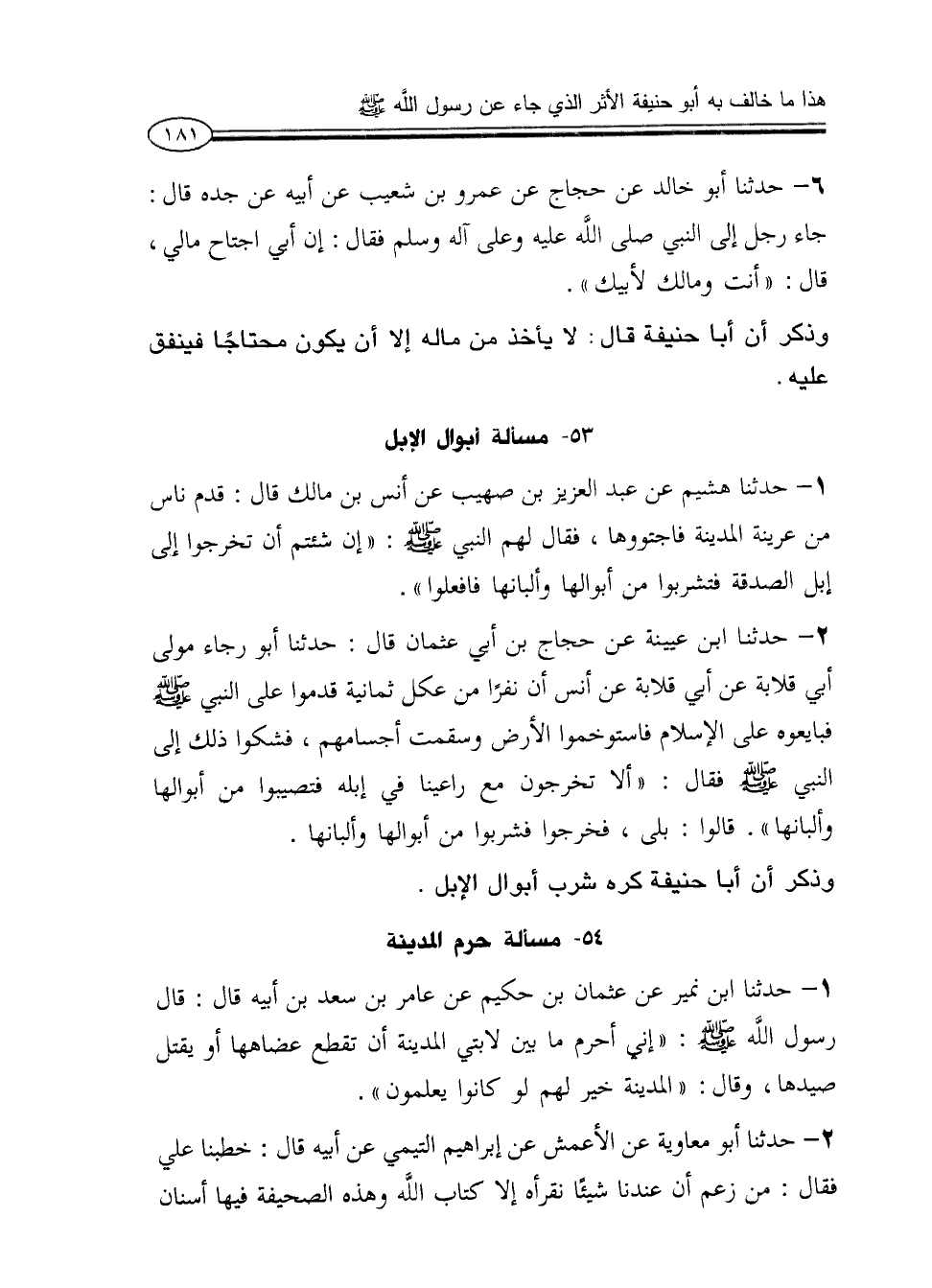 1 - حدثنا هشيم عن عبد العزيز بن صهيب عن أنس بن مالك قال: قدم ناس من عرينة المدينة فاجتووها، فقال لهم النبي صلى الله عليه وعلى آله وسلم: «إن شئتم أن تخرجوا إلى إبل الصدقة فتشربوا من أبوالها وألبانها فافعلوا».