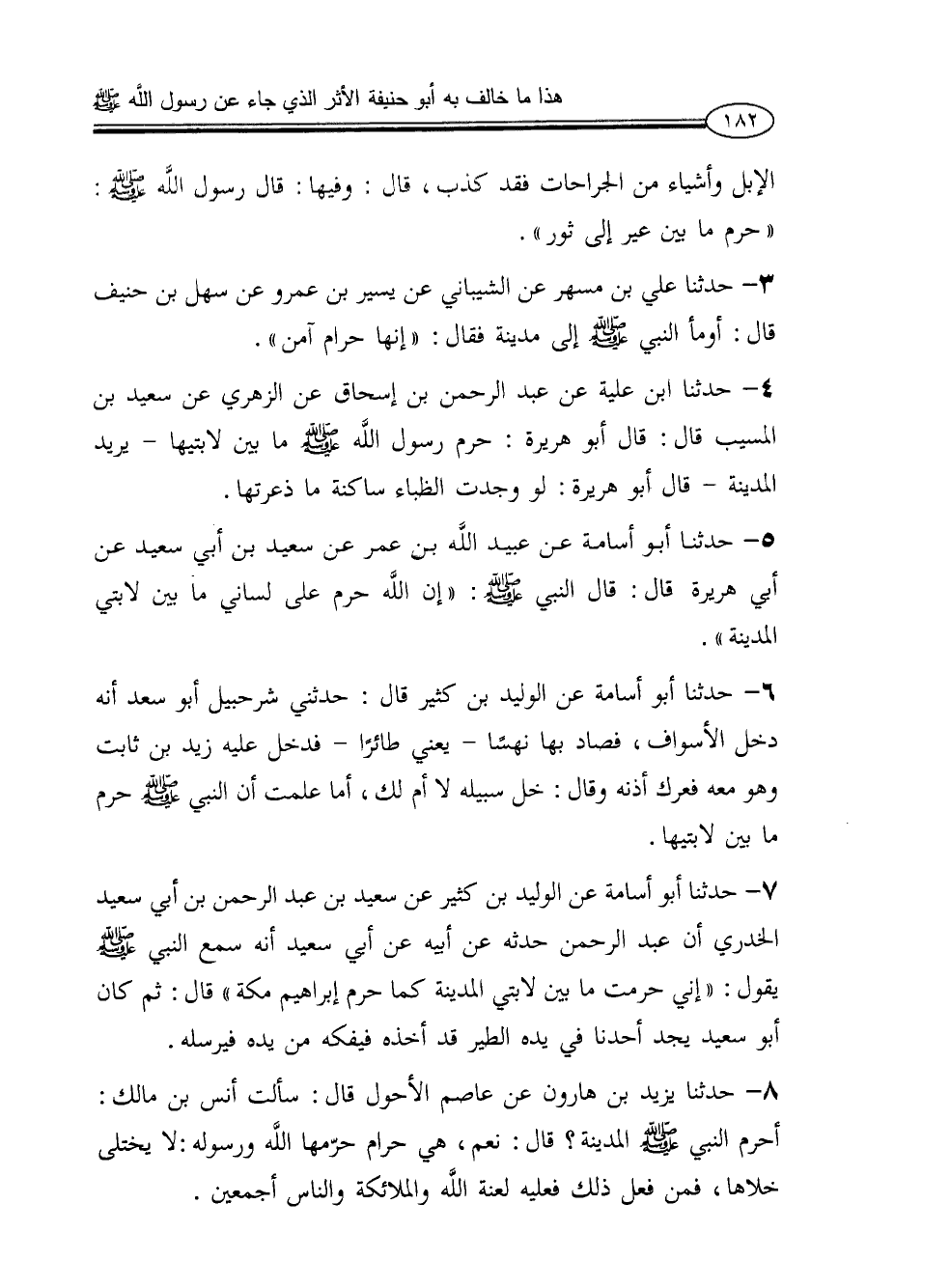 4 - حدثنا ابن علية عن عبد الرحمن بن إسحاق عن الزهري عن سعيد بن المسيب قال: قال أبو هريرة: حرم رسول الله صلى الله عليه وعلى آله وسلم ما بين لا بتيها - ويريد المدينة - قال أبو هريرة: لو وجدت الظباء ساكنة ما ذعرتها.